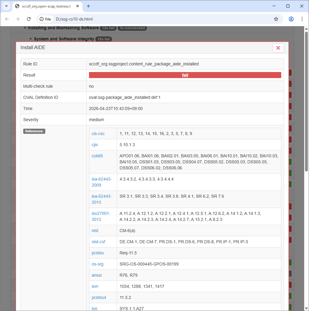 # ⇒ available modules : info, xccdf, oval, ds, cpe, cvss, cve, cvrf # [--profile] : specify profile # ⇒ available profiles are on the result you run [oscap info] command above # [--results] : output file # [--report] : output HTML report oscap xccdf eval \ --profile xccdf_org.ssgproject.content_profile_stig \ --results ssg-cs10-ds.xml \ --report ssg-cs10-ds.html \ /usr/share/xml/scap/ssg/content/ssg-cs10-ds.xml ..... ..... Title Set type of computer node name logging in audit logs Rule xccdf_org.ssgproject.content_rule_auditd_name_format Result fail Title Appropriate Action Must be Setup When the Internal Audit Event Queue is Full Rule xccdf_org.ssgproject.content_rule_auditd_overflow_action Result pass Title Write Audit Logs to the Disk Rule xccdf_org.ssgproject.content_rule_auditd_write_logs Result pass Title Verify Permissions on /etc/audit/auditd.conf Rule xccdf_org.ssgproject.content_rule_file_permissions_etc_audit_auditd Result pass Title Verify Permissions on /etc/audit/rules.d/*.rules Rule xccdf_org.ssgproject.content_rule_file_permissions_etc_audit_rulesd Result pass |