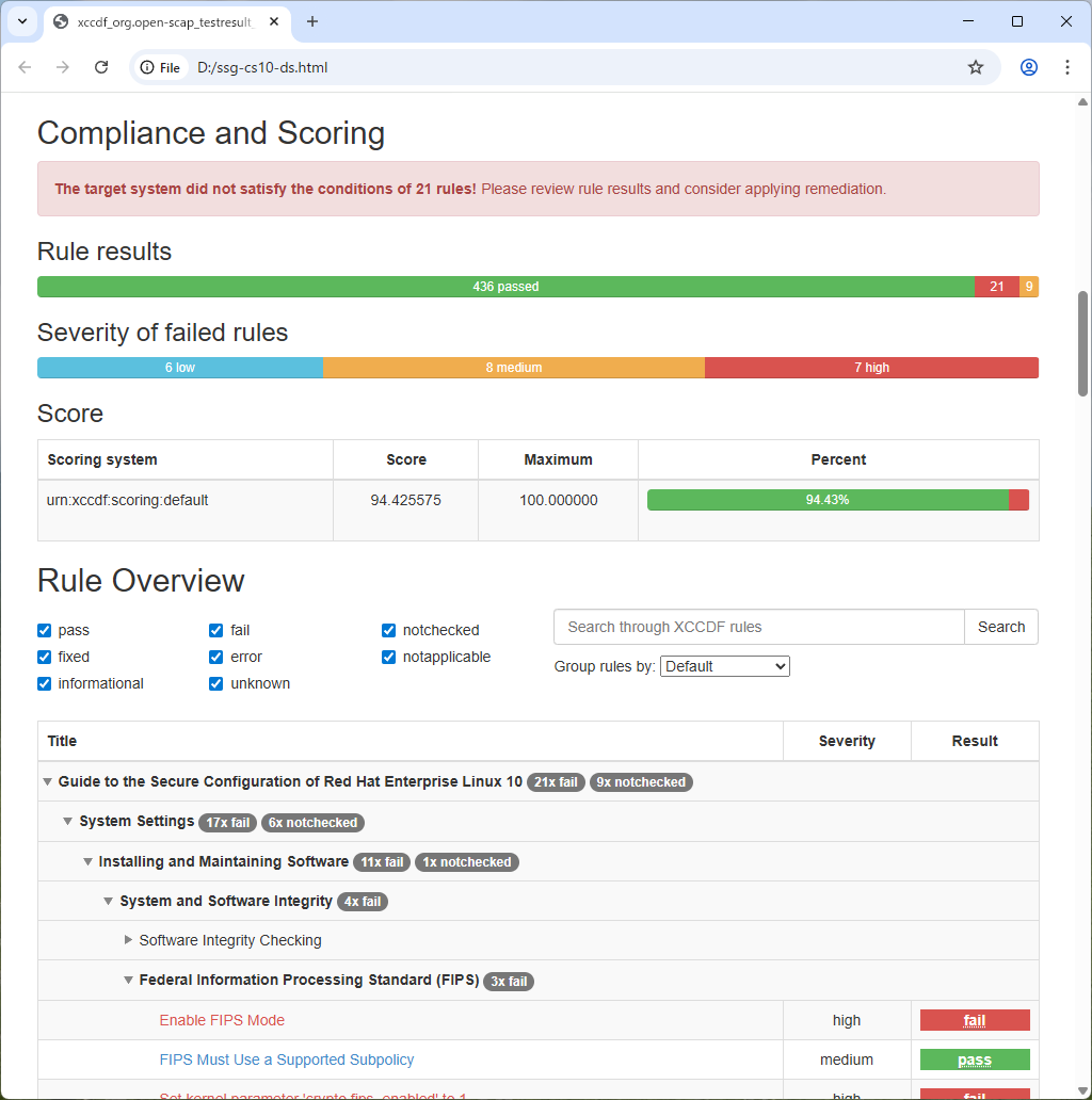 --fix-type bash \ --output ssg-cs10-ds-remediation.sh \ --result-id xccdf_org.open-scap_testresult_xccdf_org.ssgproject.content_profile_stig \ ssg-cs10-ds.xml total 16020 -rw-------. 1 root root 981 Dec 14 2024 anaconda-ks.cfg -rwx------. 1 root root 1599788 Apr 23 10:53 ssg-cs10-ds-remediation.sh -rw-r--r--. 1 root root 14797108 Apr 23 10:43 ssg-cs10-ds.xml # run remediation script [root@dlp ~]# ./ssg-cs10-ds-remediation.sh ..... ..... Remediating rule 111/112: 'xccdf_org.ssgproject.content_rule_service_usbguard_enabled' Created symlink /etc/systemd/system/basic.target.wants/usbguard.service /usr/lib/systemd/system/usbguard.service. Remediating rule 112/112: 'xccdf_org.ssgproject.content_rule_usbguard_allow_hid_and_hub' # check again [root@dlp ~]# oscap xccdf eval \ --profile xccdf_org.ssgproject.content_profile_stig \ --results ssg-cs10-ds.xml \ --report ssg-cs10-ds.html \ /usr/share/xml/scap/ssg/content/ssg-cs10-ds.xml |