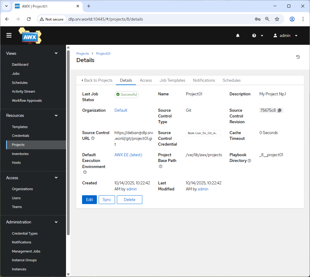 | [2] | When you create new Playbooks on the repository set as Source Control, it needs to sync them with AWX. Login to Ansible AWX Web and click [Projects] on the left pane and open the project you added, and then, click [Sync] button to import new Playbooks. |
