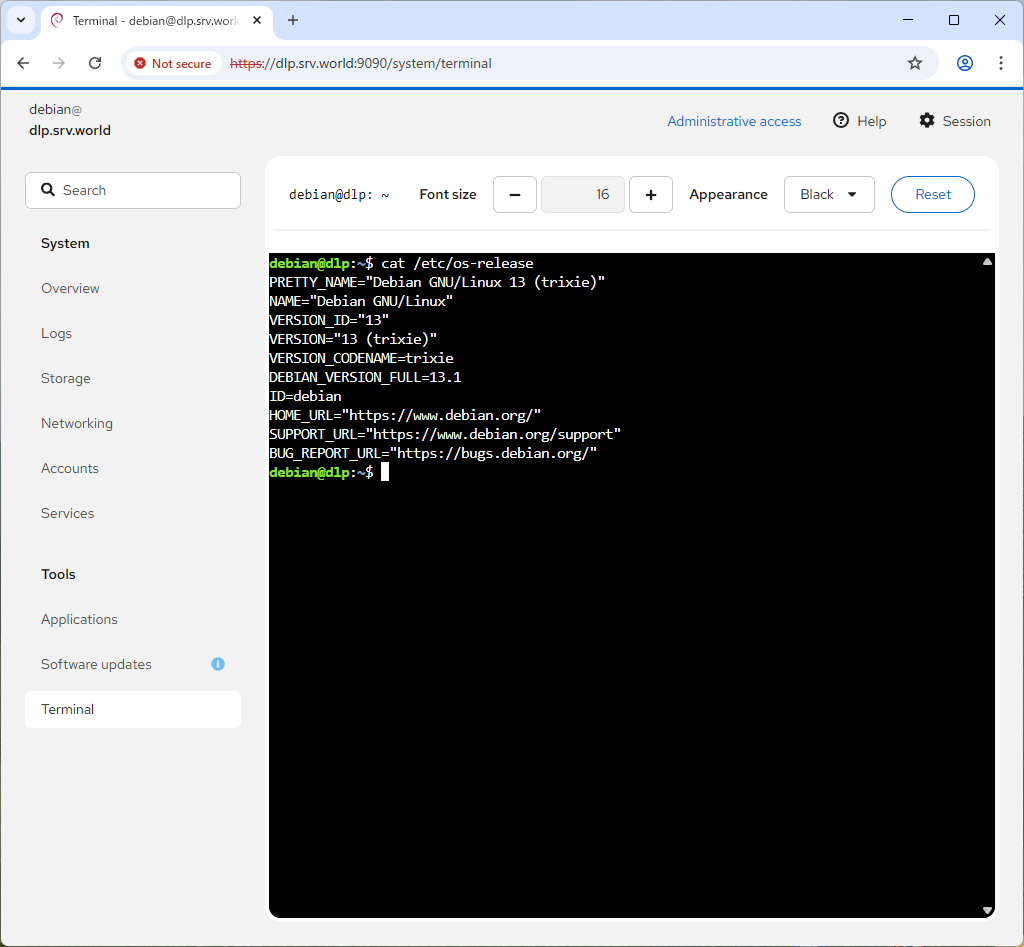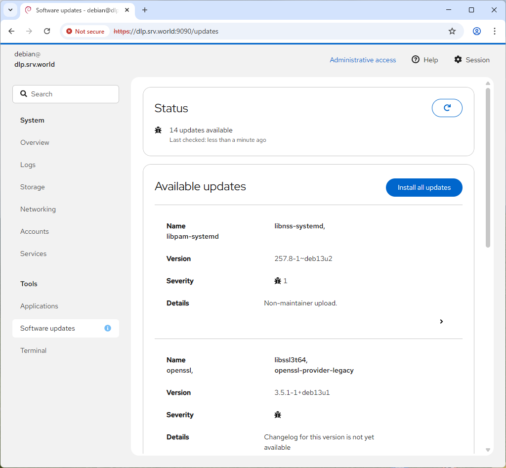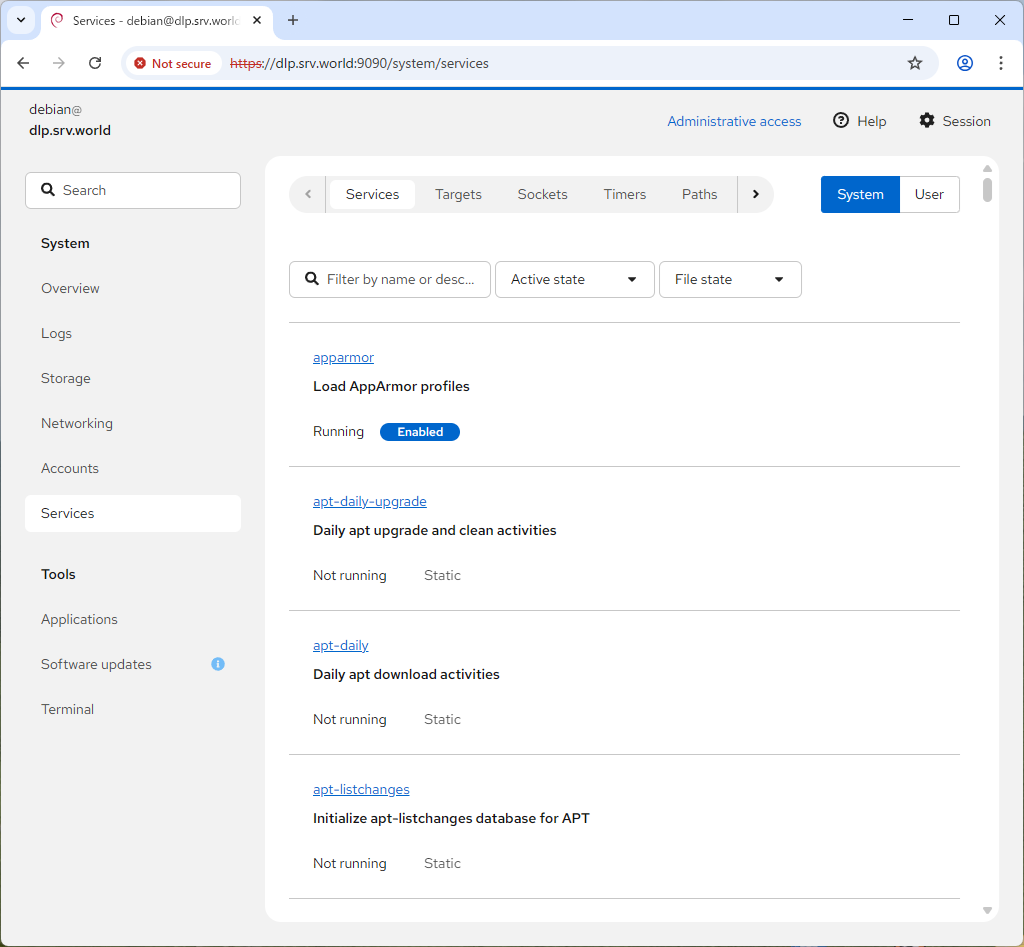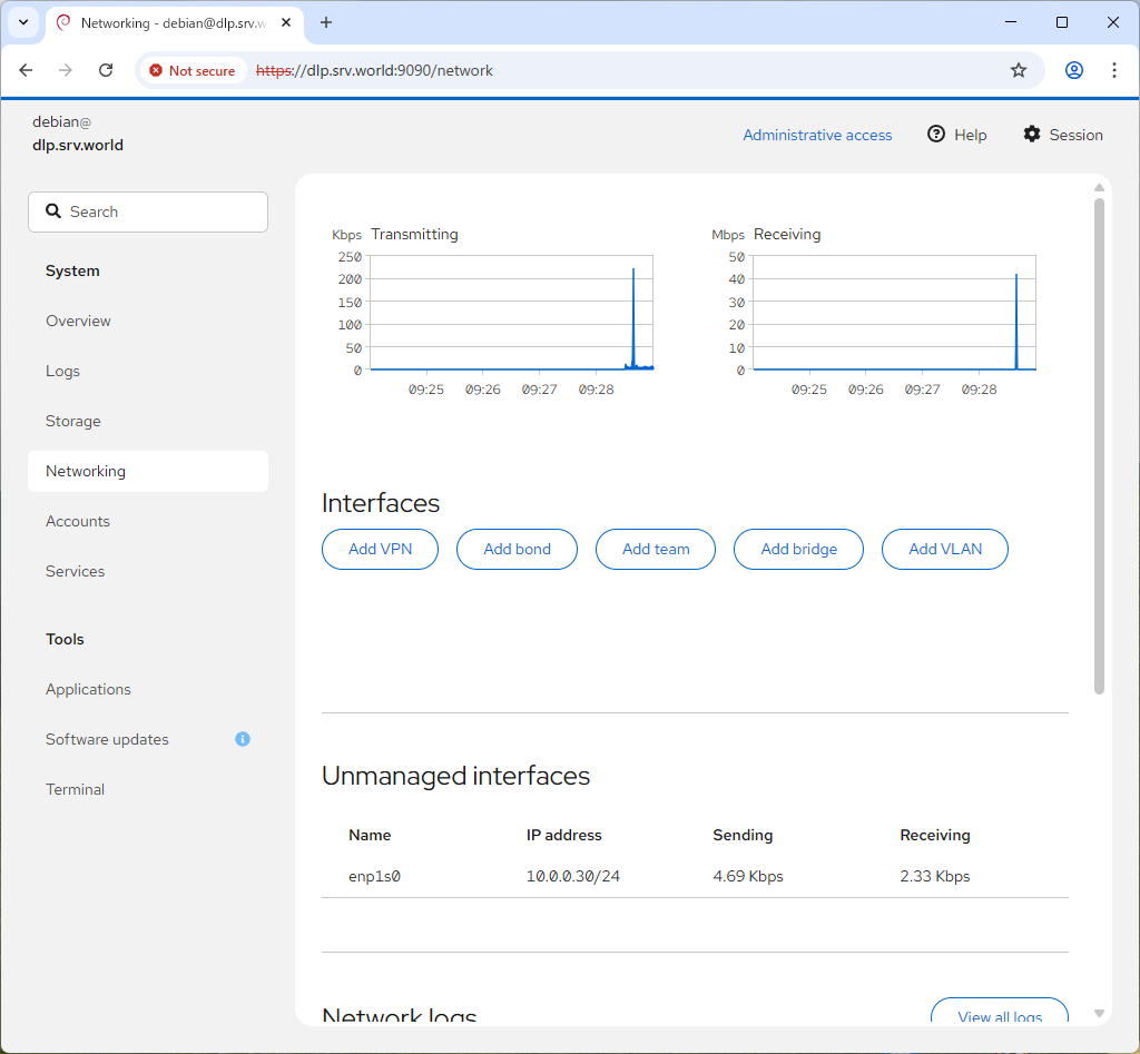 [3] | This is the Cockpit index page. It's possible to manage various system settings on here. If you like to use admin privilege, clisk the [Turn on administrative access] button to authenticate. |