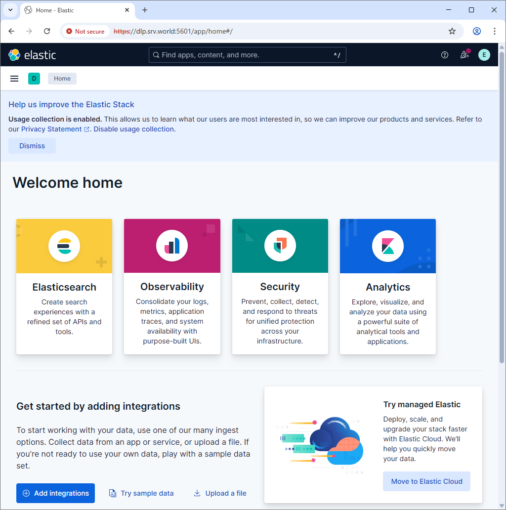 # generate an enrollment token for Kibana root@dlp:~# /usr/share/elasticsearch/bin/elasticsearch-create-enrollment-token -s kibana eyJ2ZXIiOiI4LjE0LjAiLCJhZHIiOlsiMTAuMC4wLjMwOjkyMDAiXSwiZmdyIjoiYmY1ZTg4MzdiY2EzMWJhNWRmOWRiOWZiNGU4MGRlZDdlOTc4ZGU2ZjAwMmUxNmUyOGVlYWE1ZWM2NGY3NGJiOSIsImtleSI6InBqTlY2cGtCVjl0VXBJSUFJemR5OkZTemxud0xpbkJBM3JUa2hCX2dBR2cifQ== # setup Kibana root@dlp:~# /usr/share/kibana/bin/kibana-setup --enrollment-token \ eyJ2ZXIiOiI4LjE0LjAiLCJhZHIiOlsiMTAuMC4wLjMwOjkyMDAiXSwiZmdyIjoiYmY1ZTg4MzdiY2EzMWJhNWRmOWRiOWZiNGU4MGRlZDdlOTc4ZGU2ZjAwMmUxNmUyOGVlYWE1ZWM2NGY3NGJiOSIsImtleSI6InBqTlY2cGtCVjl0VXBJSUFJemR5OkZTemxud0xpbkJBM3JUa2hCX2dBR2cifQ== Native global console methods have been overridden in production environment. ✓ Kibana configured successfully. To start Kibana run: bin/kibana