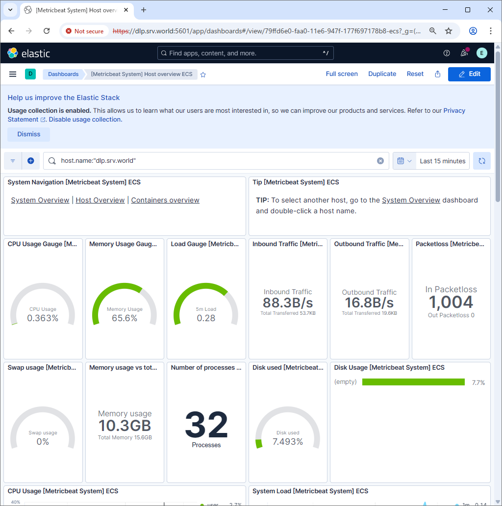# line 3049 : if use Kibana, uncomment and specify output host # if SSL is enabled on Kibana, uncomment ssl related lines # [username] and [password] is the admin user's one # if using self-signed certificate, specify [ssl.verification_mode: none] setup.kibana: # Kibana Host # Scheme and port can be left out and will be set to the default (http and 5601) # In case you specify and additional path, the scheme is required: http://localhost:5601/path # IPv6 addresses should always be defined as: https://[2001:db8::1]:5601 host: "https://dlp.srv.world:5601" # Optional protocol and basic auth credentials. protocol: "https" username: "elastic" password: "password" # Optional HTTP path #path: "" # Optional Kibana space ID. #space.id: "" # Use SSL settings for HTTPS. ssl.enabled: true ..... ..... # after very careful consideration. It is primarily intended as a temporary # diagnostic mechanism when attempting to resolve TLS errors; its use in # production environments is strongly discouraged. # The default value is full. ssl.verification_mode: noneroot@dlp:~# systemctl enable --now metricbeat