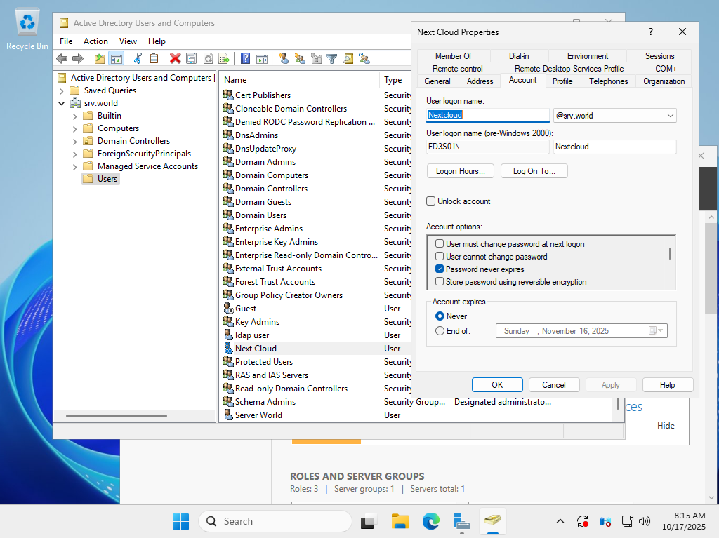 | [4] | On Active Directory side, create an AD user for binding from NextCloud Server. It's OK to grant [Domain Users] rights only for it. On this example, it creates [nextcloud] user like follows. |