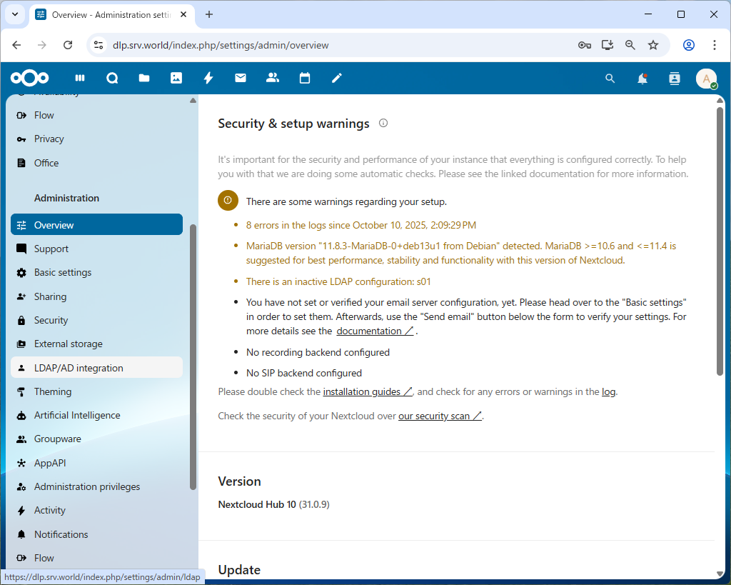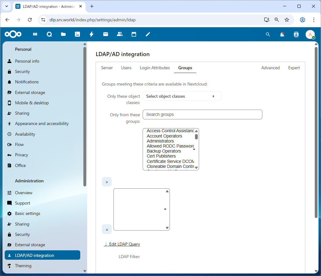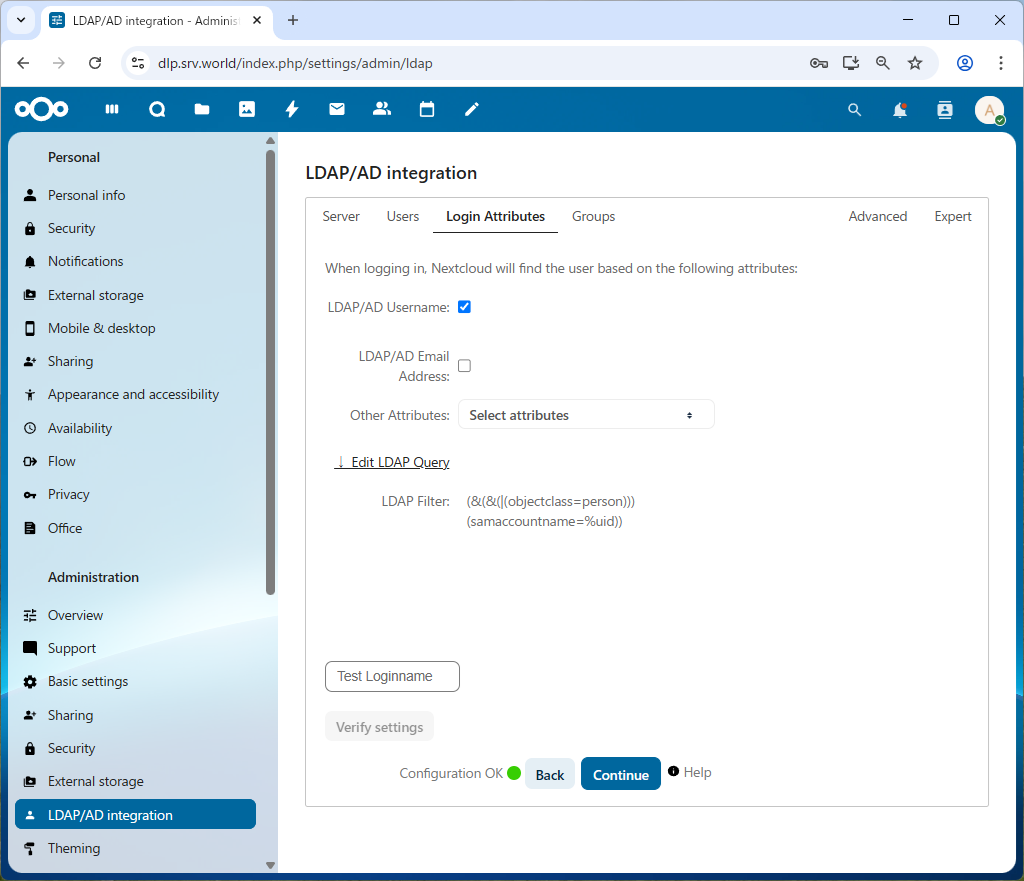 | [7] | After enabling [LDAP user and group backend], open settings again and select [Administration] - [LDAP / AD integration] on the left pane. |