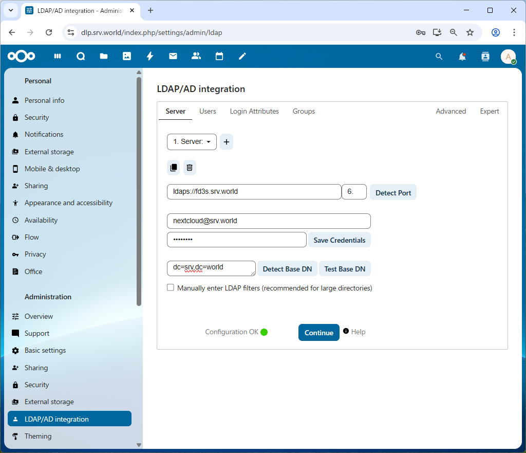 | [8] | Input AD server's information to connect. Input AD's hostname or IP address and Base DN, credentials of AD user for binding created in [3], and then click [Save Credentials] button. Next, Click [Test Base DN] button and if [Configuration OK] message is displayed like follows, that's OK, Click [Continue] to proceed. |
