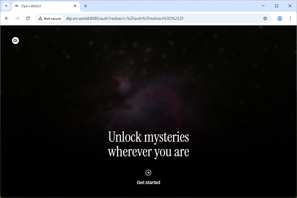 | [4] | Launch a web browser on any client computer and access the application to check that it works. When you access the application, the following screen will appear, click [Get started]. |