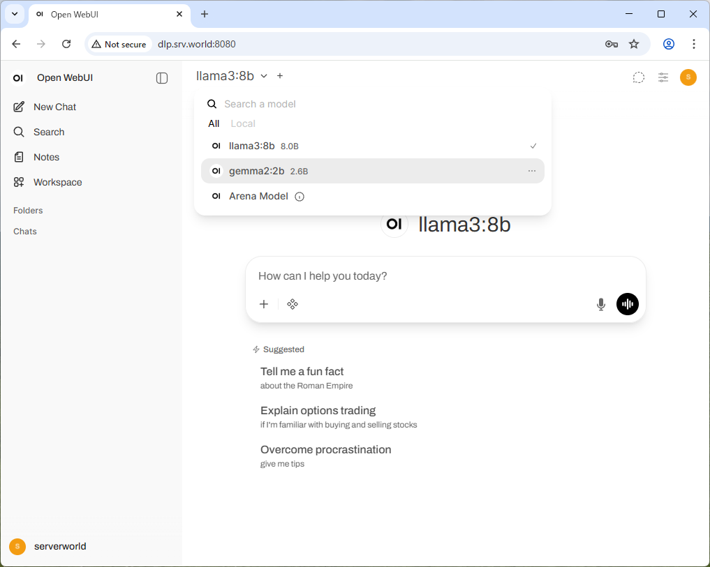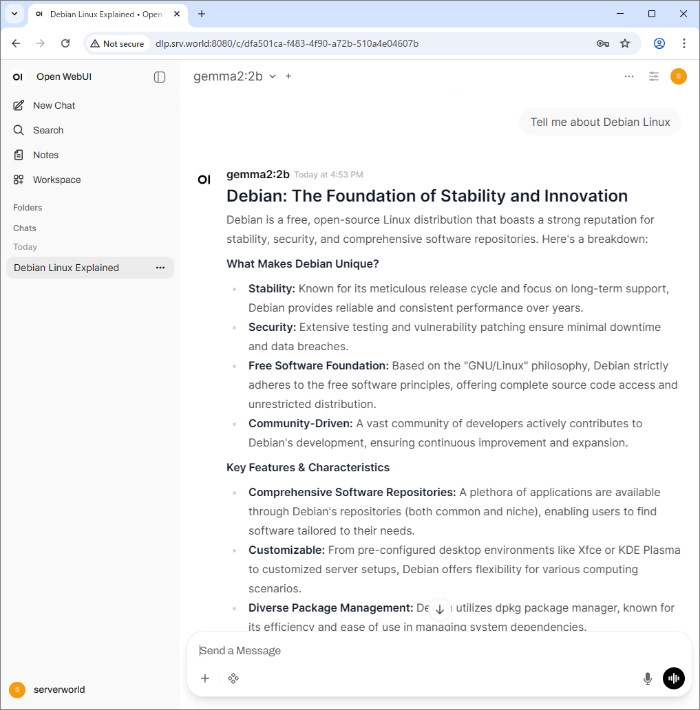| [9] | To use Chat, select the model you have loaded into Ollama from the top menu, enter a message in the bottom section, and you will receive a reply. |