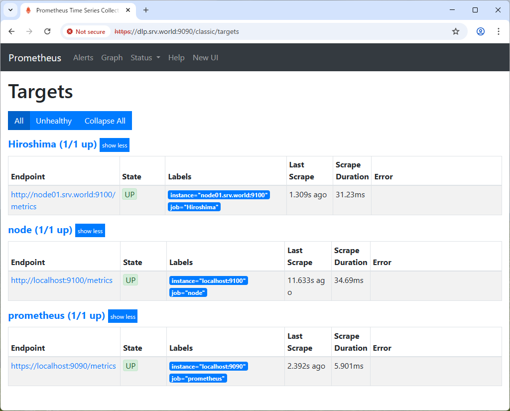 - targets: ['localhost:9100', 'node01.srv.world:9100']