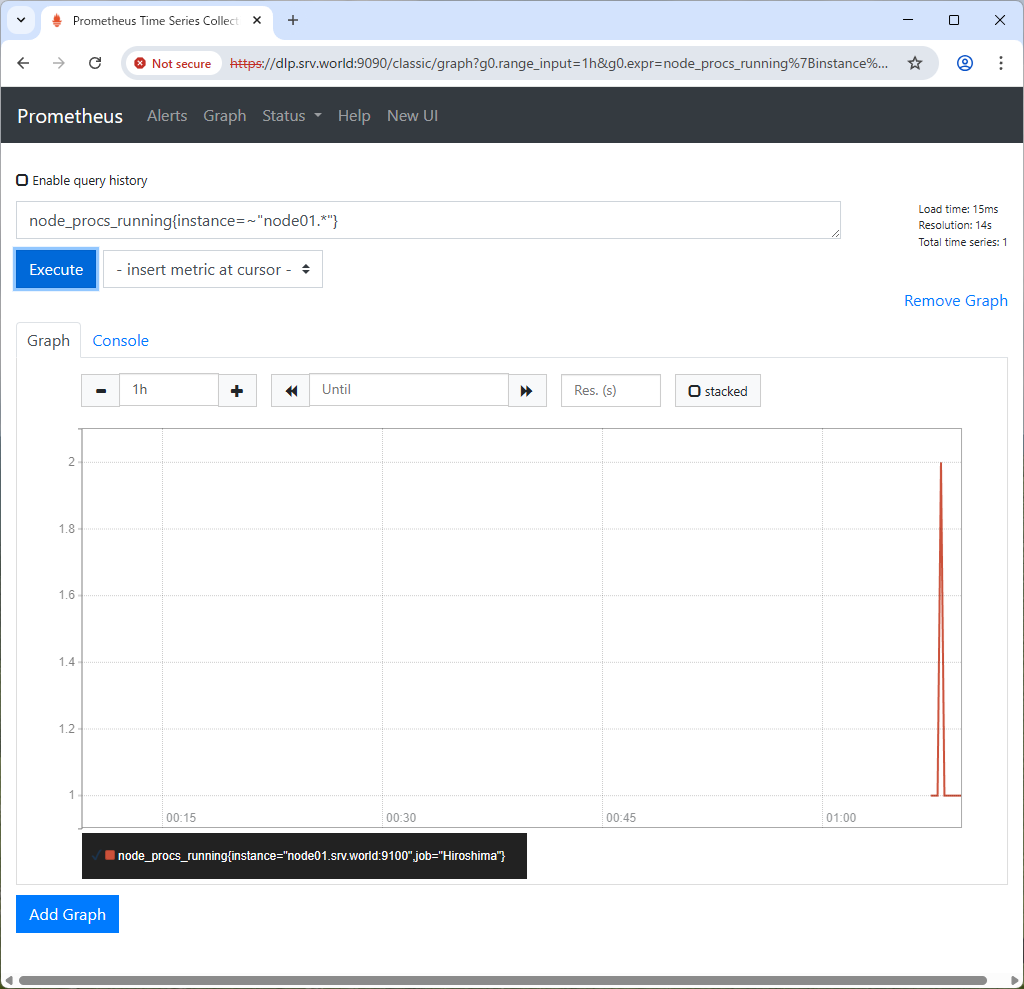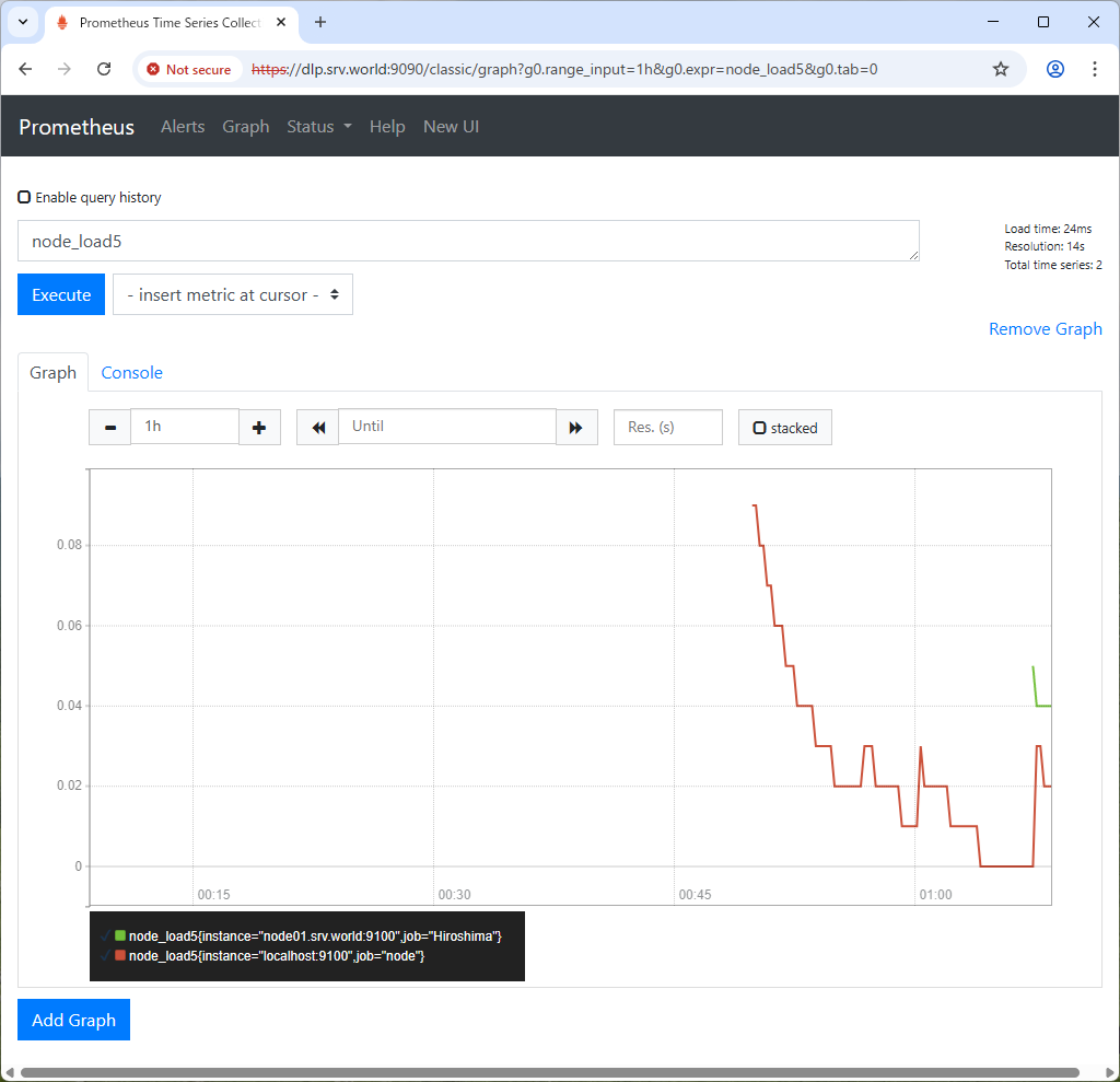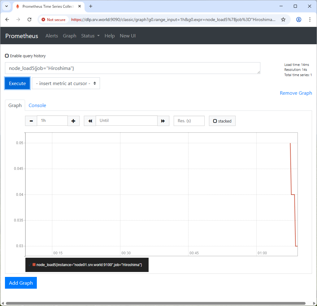 | [4] | To input query directly, it's possible to display specific Job or Node. The example below shows a Job for [node_load5]. ⇒ node_load5{job="Hiroshima"} |