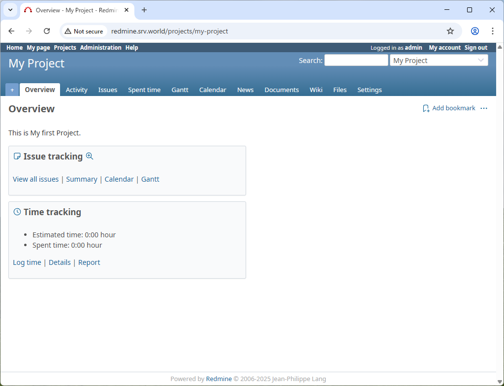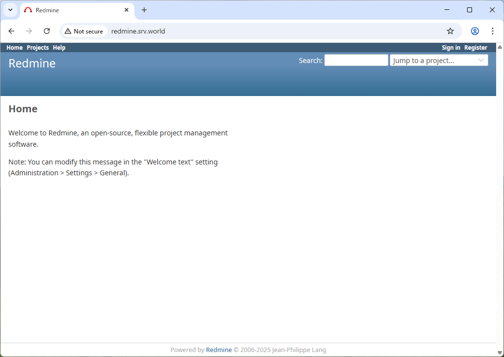 [9] | Access to the URL you configured on Apache2, then Redmine's index site is shown like follows. Click [Sing in] link. |