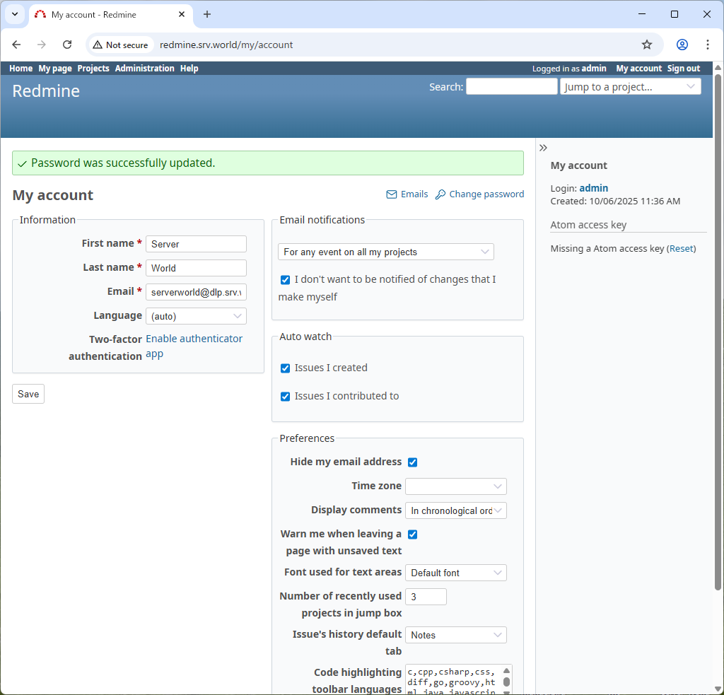 vi /etc/apache2/conf-available/passenger.conf # create new LoadModule passenger_module /var/lib/gems/3.3.0/gems/passenger-6.1.0/buildout/apache2/mod_passenger.so PassengerRoot /var/lib/gems/3.3.0/gems/passenger-6.1.0 PassengerDefaultRuby /usr/bin/ruby3.3 <VirtualHost *:80> ServerName redmine.srv.world DocumentRoot /var/www/redmine/public </VirtualHost> <Directory "/var/www/redmine/public"> Options FollowSymLinks AllowOverride All </Directory> chown -R www-data:www-data /var/www/redmine root@dlp:/var/www/redmine# a2enconf passenger root@dlp:/var/www/redmine# systemctl reload apache2 |