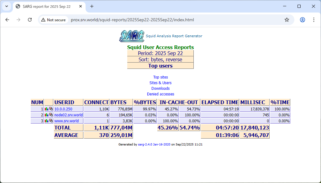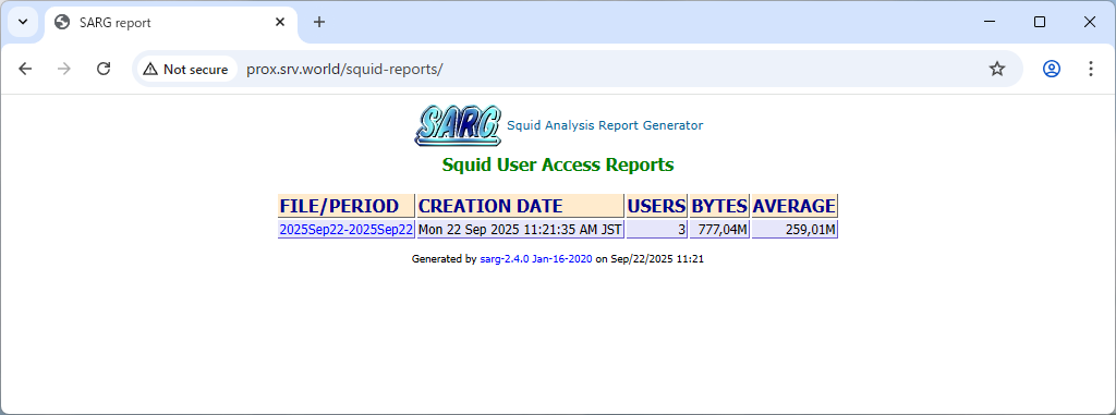 | [3] | Access to [(you servers hostname or IP address)/squid-reports/] with Web Browser on a Client Computer, then Squid Log Reports site is shown and it's possible to Proxy statics. |