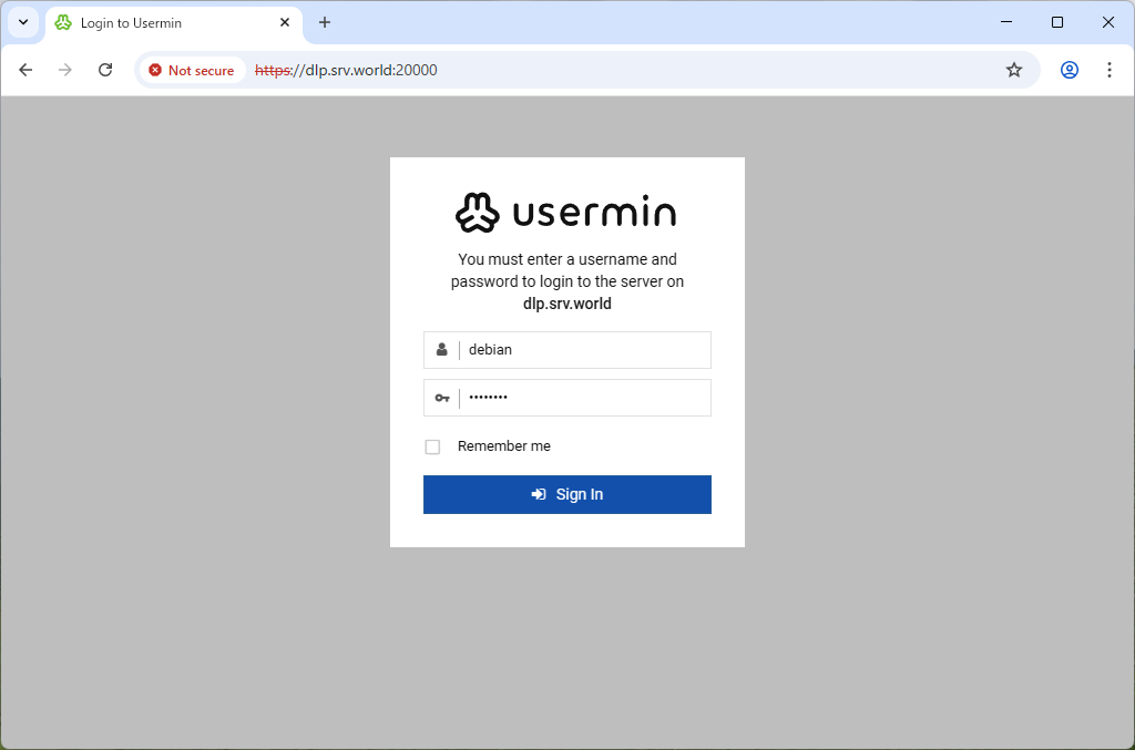| [3] | Access to the [https://(server's hostname or IP address):20000/] from a client computer which is in the network you allowed. Then, Usermin login form is displayed, it's possible to login as any OS common user account. |