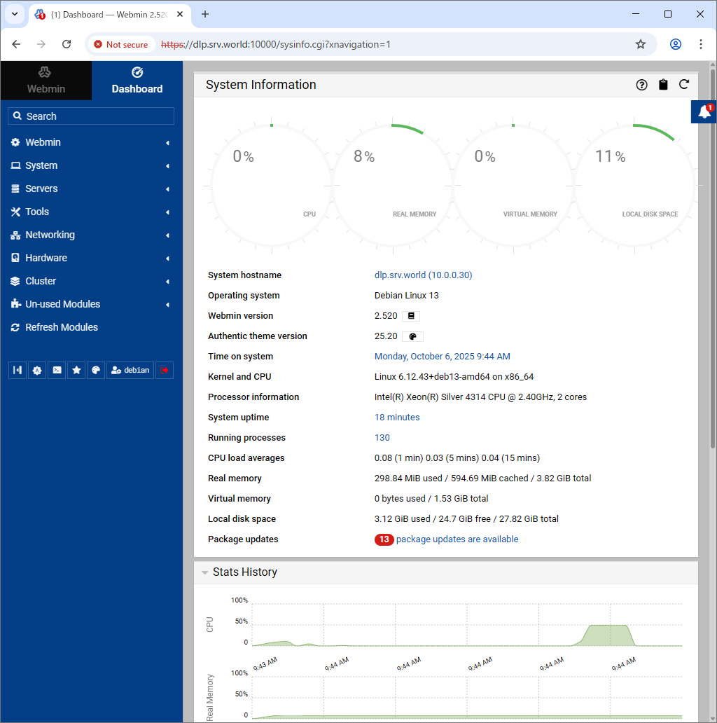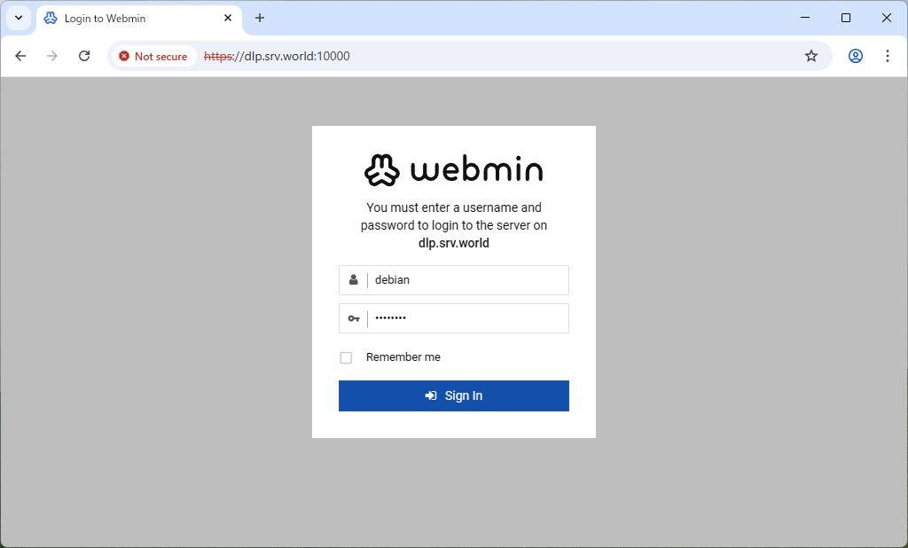 root@dlp:~# wget https://www.webmin.com/download/deb/webmin-current.deb root@dlp:~# dpkg -i webmin-current.deb electing previously unselected package webmin. (Reading database ... 40897 files and directories currently installed.) Preparing to unpack webmin-current.deb ... Unpacking webmin (2.520) ... Setting up webmin (2.520) ...