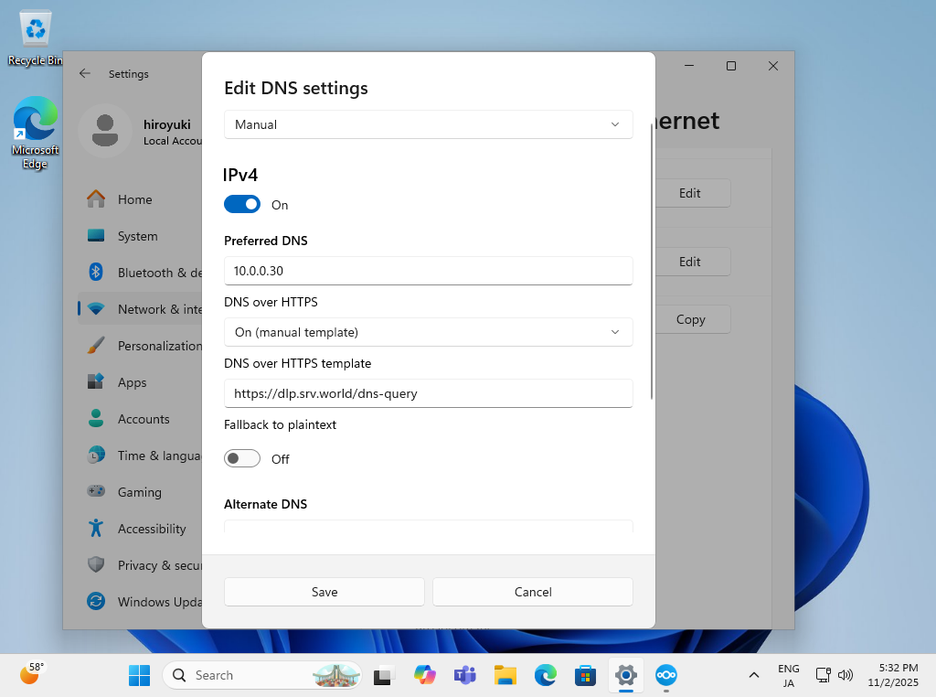 | [3] | Open the Network setting and click the [Edit] button on [DNS server assignment] section. Next, Input your DoH Server address on the [Preferred DNS] section. For [DNS over HTTPS] section, select [On (manual template)] and For [DNS over HTTPS template] section, input the value of [endpoints] in named.conf you set. |