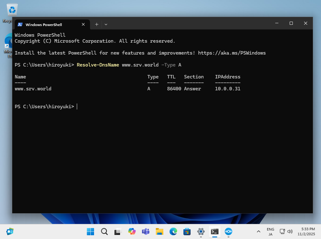 # verify resolution [root@node01 ~]# dig www.srv.world. ; <<>> DiG 9.18.39 <<>> www.srv.world. ;; global options: +cmd ;; Got answer: ;; ->>HEADER<<- opcode: QUERY, status: NOERROR, id: 12981 ;; flags: qr rd ra; QUERY: 1, ANSWER: 1, AUTHORITY: 0, ADDITIONAL: 1 ;; OPT PSEUDOSECTION: ; EDNS: version: 0, flags:; udp: 65494 ;; QUESTION SECTION: ;www.srv.world. IN A ;; ANSWER SECTION: www.srv.world. 86400 IN A 10.0.0.31 ;; Query time: 3 msec ;; SERVER: 127.0.0.53#53(127.0.0.53) (UDP) ;; WHEN: Mon Nov 03 10:28:00 JST 2025 ;; MSG SIZE rcvd: 58 |