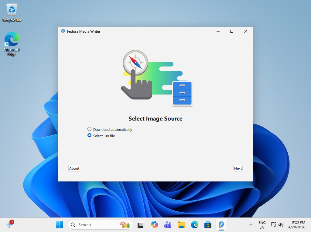 | [3] | Attach USB stick to your computer. Next, run Fedora Media Writer and select [select .iso file] option. |