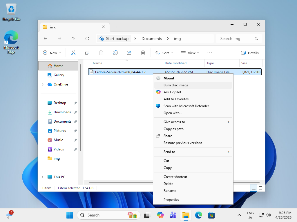 | [5] | Insert an empty DVD to optical drive. Next, right-click the ISO image of Fedora and select [Burn Disk image] in the menu. |