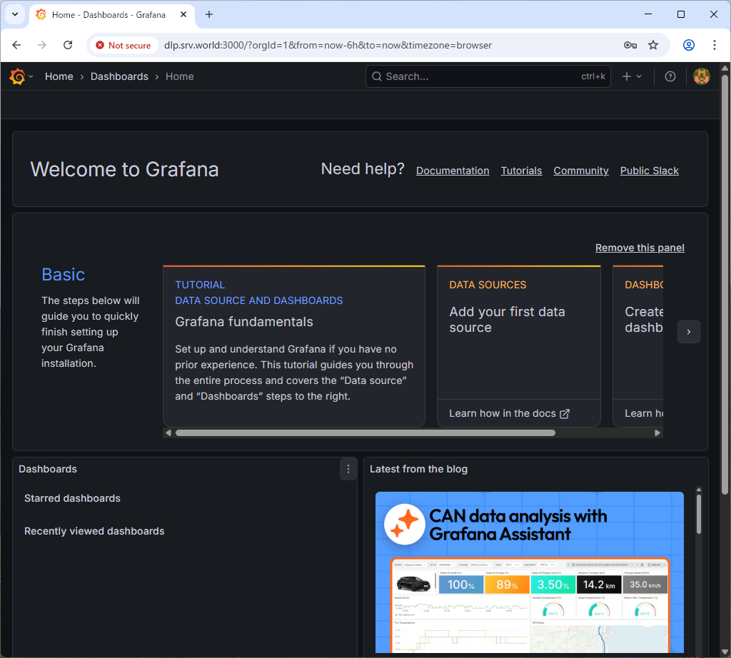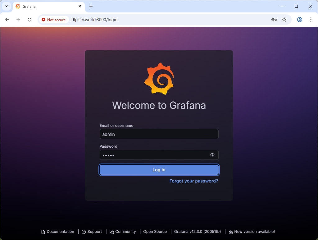 vi /usr/local/etc/grafana/grafana.ini # line 39 : specify protocol ⇒ possible to change to [https], [h2], [socket] protocol = http # line 45 : IP address Grafana listens ⇒ listens [0.0.0.0] with the default below ;http_addr = # line 48 : specify port ⇒ possible to change to other port ;http_port = 3000 # line 51 : specify domain name ⇒ possible to change to your domain name ;domain = localhost # line 74 : specify your certificate if you set [https] or [h2] for protocol # need [grafana] user can read cert and key cert_file = /usr/local/etc/letsencrypt/live/dlp.srv.world/fullchain.pem cert_key = /usr/local/etc/letsencrypt/live/dlp.srv.world/privkey.pem