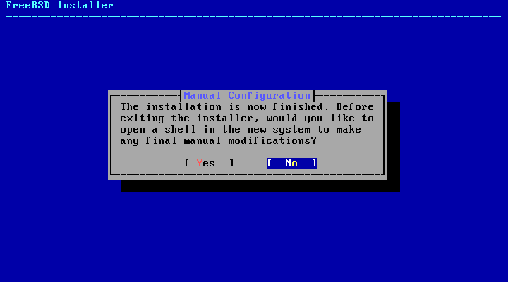 | [21] | Installation is complete. Click Yes to open a shell to perform additional manual configuration before rebooting the system, or No to reboot immediately. |