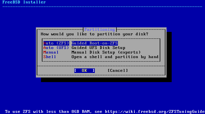 | [8] | This is the disk partition configuration. From top to bottom, there are automatic configuration using the ZFS file system, automatic configuration using the UFS file system, manual configuration, and manual configuration via the shell. Configure as needed. In this example, we will proceed with [Auto (ZFS)]. |