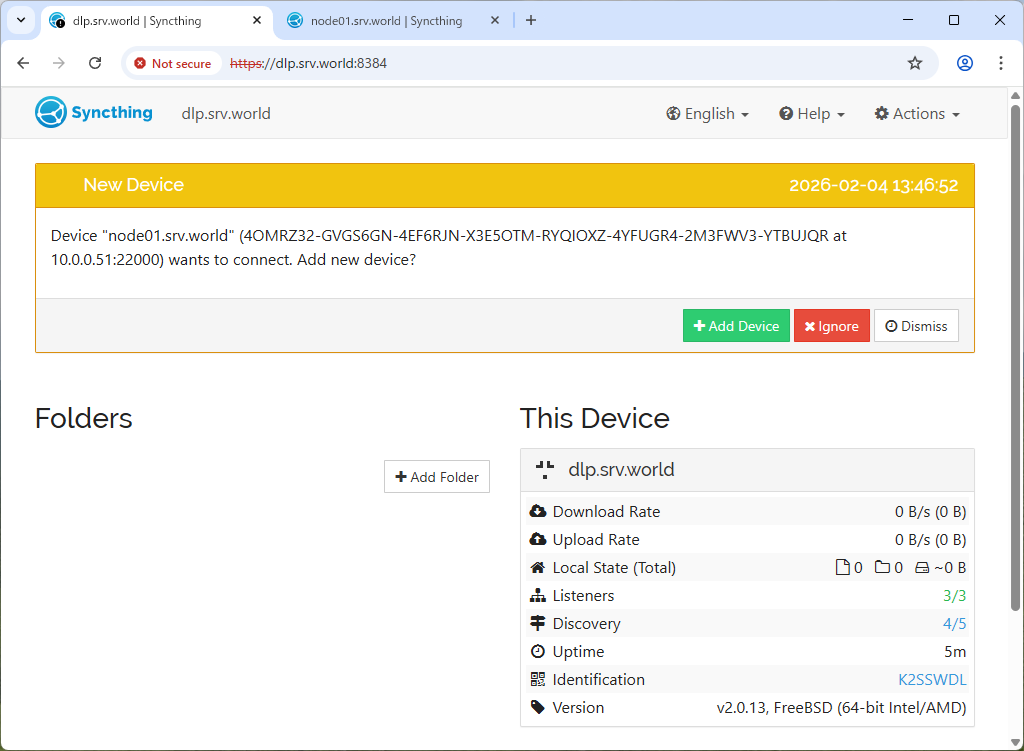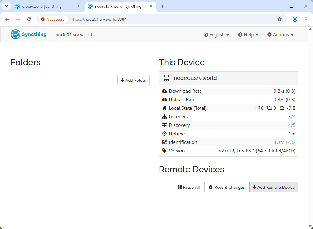 | [6] | Log in to the other Syncthing host and click [Add Remote Device] in the bottom right. |