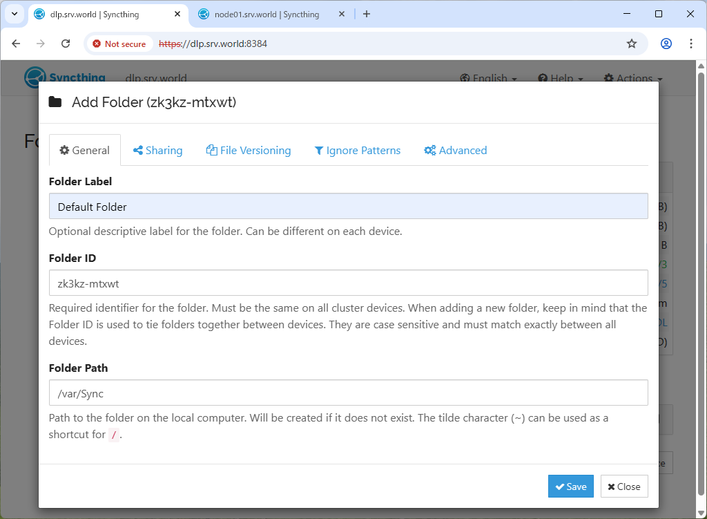 Copy files or directories from one location to an another localtion by [Syncthing]. This example is based on the environment like follows.+----------------------+ | +----------------------+ | dlp.srv.world |10.0.0.30 | 10.0.0.51| node01.srv.world | | +----------+----------+ | | | <-------------> | | +----------------------+ sync +----------------------+ |