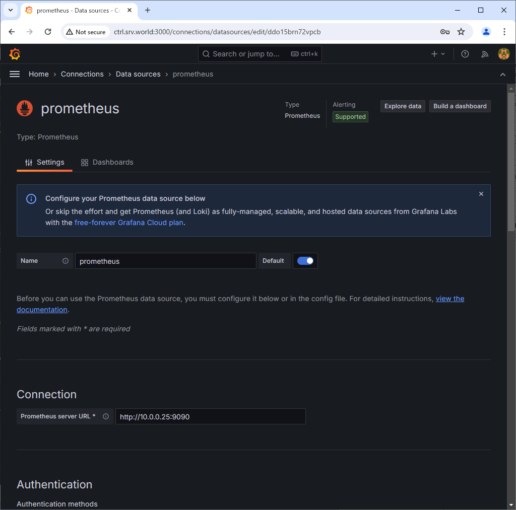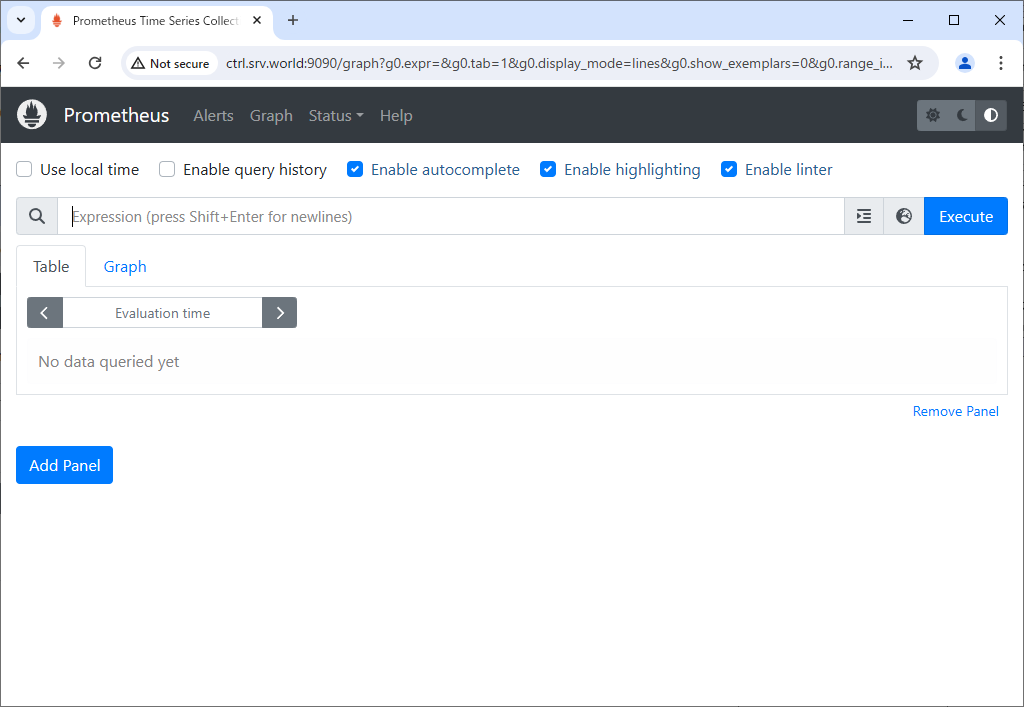 root@ctrl:~# kubectl get pods -n monitoring NAME READY STATUS RESTARTS AGE alertmanager-prometheus-kube-prometheus-alertmanager-0 2/2 Running 0 66s prometheus-kube-prometheus-blackbox-exporter-7f9487fc-45vwl 1/1 Running 0 88s prometheus-kube-prometheus-operator-6d88786cf8-kmwdx 1/1 Running 0 88s prometheus-kube-state-metrics-5bfdb58c6d-9jzrk 1/1 Running 0 88s prometheus-node-exporter-bzswr 1/1 Running 0 88s prometheus-node-exporter-tdn7z 1/1 Running 0 88s prometheus-prometheus-kube-prometheus-prometheus-0 2/2 Running 0 66s # if access from outside of cluster, set port-forwarding root@ctrl:~# kubectl port-forward -n monitoring service/prometheus-kube-prometheus-prometheus --address 0.0.0.0 9090:9090 & |