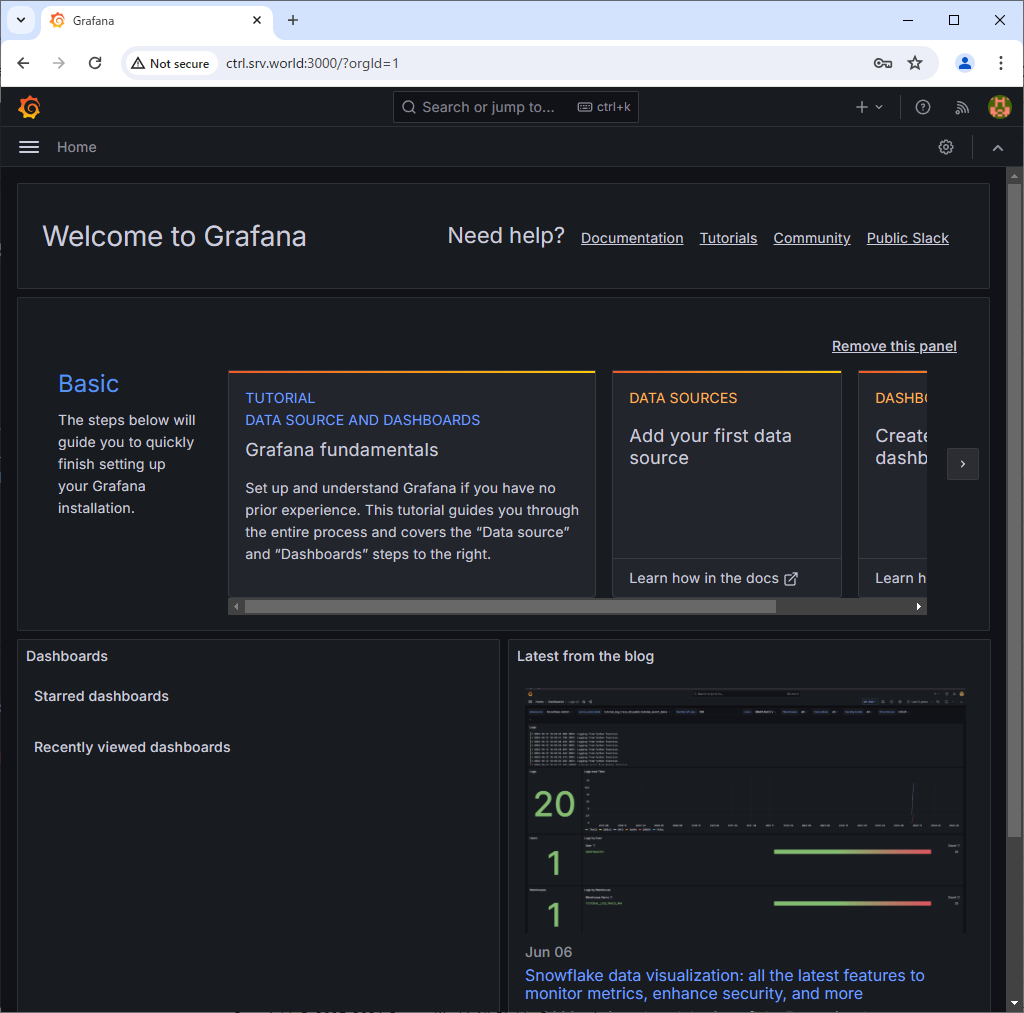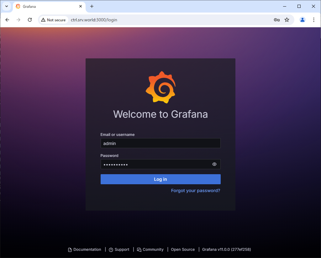 root@ctrl:~# kubectl get pods -n monitoring NAME READY STATUS RESTARTS AGE alertmanager-prometheus-kube-prometheus-alertmanager-0 2/2 Running 0 4m10s grafana-66b58c8f46-kcgjq 1/1 Running 0 64s prometheus-kube-prometheus-blackbox-exporter-7f9487fc-45vwl 1/1 Running 0 4m32s prometheus-kube-prometheus-operator-6d88786cf8-kmwdx 1/1 Running 0 4m32s prometheus-kube-state-metrics-5bfdb58c6d-9jzrk 1/1 Running 0 4m32s prometheus-node-exporter-bzswr 1/1 Running 0 4m32s prometheus-node-exporter-tdn7z 1/1 Running 0 4m32s prometheus-prometheus-kube-prometheus-prometheus-0 2/2 Running 0 4m10s # if access from outside of cluster, set port-forwarding root@ctrl:~# kubectl port-forward -n monitoring service/grafana --address 0.0.0.0 3000:3000 & |