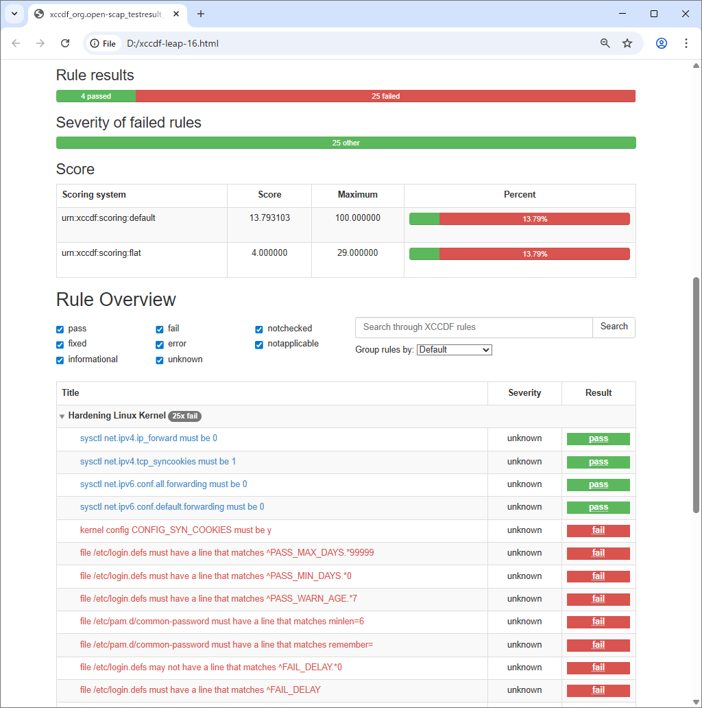 # ⇒ available modules : info, xccdf, oval, ds, cpe, cvss, cve, cvrf # [--profile] : specify profile # ⇒ available profiles are on the result you run [oscap info] command above # [--results] : output file # [--report] : output HTML report oscap xccdf eval \ --profile Default \ --report xccdf-leap-16.html \ /usr/share/openscap/scap-yast2sec-xccdf.xml --- Starting Evaluation --- Title sysctl net.ipv4.ip_forward must be 0 Rule rule-sysctl-ipv4-forward Result pass Title sysctl net.ipv4.tcp_syncookies must be 1 Rule rule-sysctl-ipv4-tcpsyncookies Result pass Title sysctl net.ipv6.conf.all.forwarding must be 0 Rule rule-sysctl-ipv6-all-forward Result pass Title sysctl net.ipv6.conf.default.forwarding must be 0 Rule rule-sysctl-ipv6-default-forward Result pass Title kernel config CONFIG_SYN_COOKIES must be y Rule rule-kernel-syncookies Result fail Title file /etc/login.defs must have a line that matches ^PASS_MAX_DAYS.*99999 Rule rule-pwd-maxdays Result fail ..... ..... |
