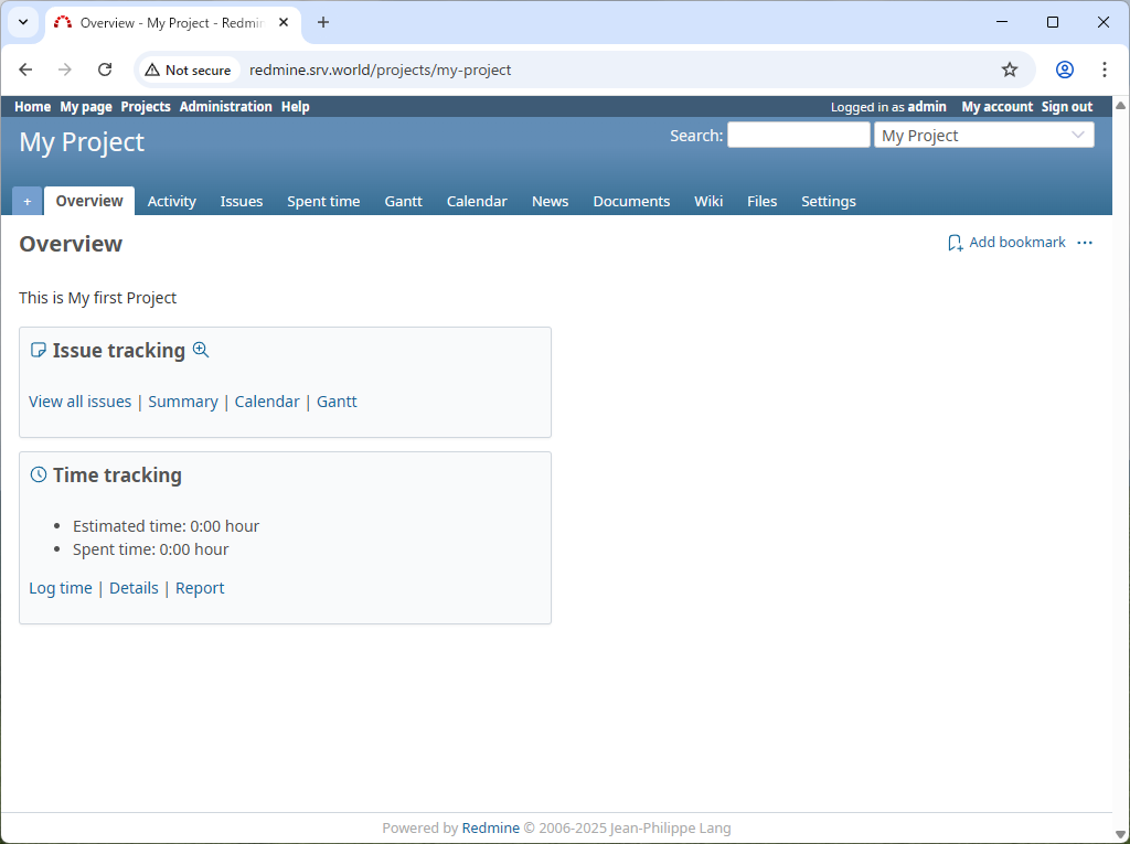 | [9] | Access to the URL you configured on httpd, then Redmine index is shown like follows. Click [Sing in] link. |