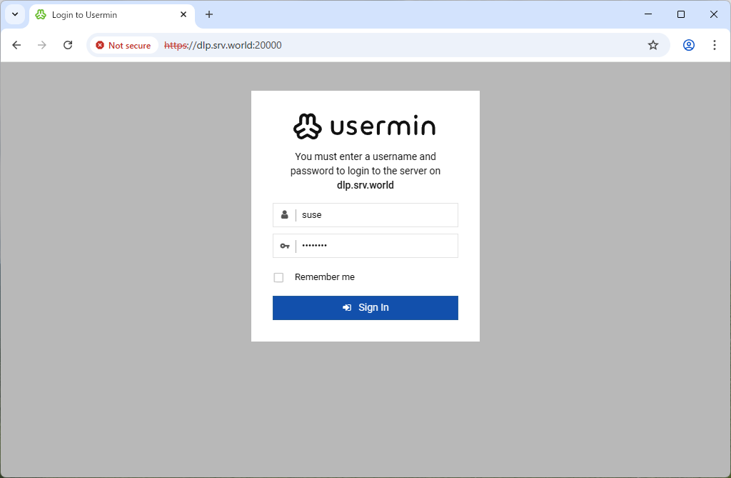 | [4] | Access to the [https://(server's hostname or IP address):20000/] from a client computer which is in the network you allowed. Then, Usermin login form is displayed, it's possible to login as any OS common user account. |