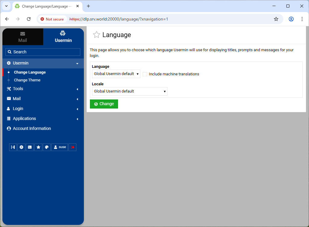 | [6] | You can change to your language to click [Usermin] - [Change Language] on the left pane and click [Display in language] on the right pane. |