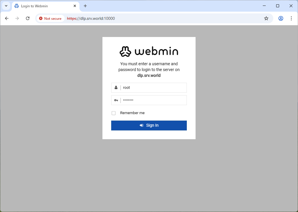 | [4] | Access to the [https://(server's hostname or IP address):10000/] from a client computer which is in the network you allowed. Then, Webmin login form is displayed, it's possible to login as any OS user account. |