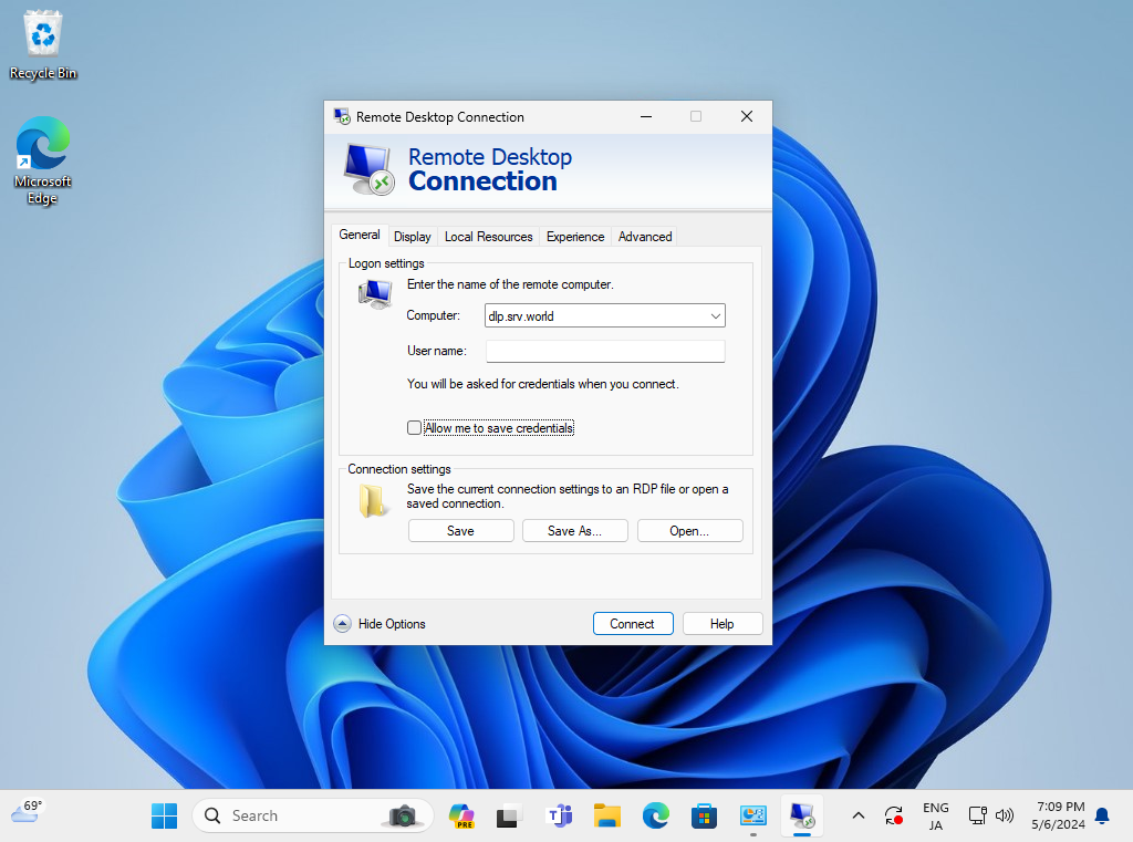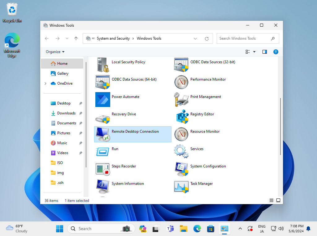 | [4] | Windows क्लाइंट से कनेक्ट करें. उदाहरण के लिए Windows 11 पर। रिमोट डेस्कटॉप ऐप शुरू करने के लिए स्टार्ट मेनू - [विंडोज टूल] - [रिमोट डेस्कटॉप कनेक्शन] खोलें। |