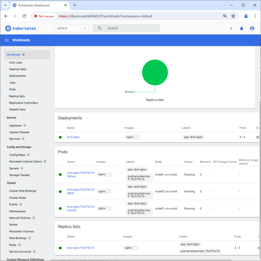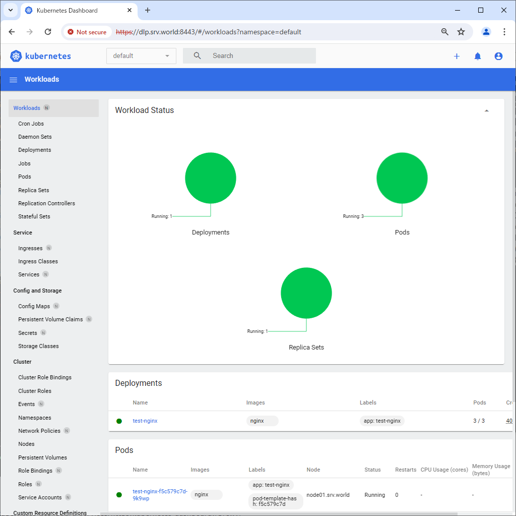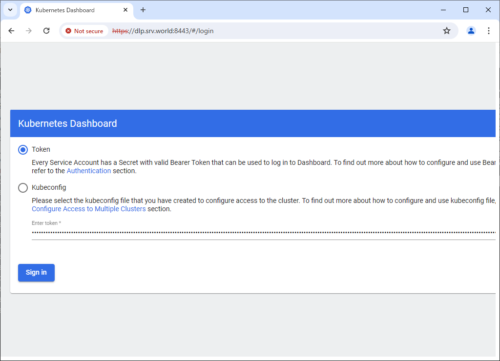 [root@dlp ~]# kubectl apply -f https://raw.githubusercontent.com/kubernetes/dashboard/v2.7.0/aio/deploy/recommended.yaml namespace/kubernetes-dashboard created serviceaccount/kubernetes-dashboard created service/kubernetes-dashboard created secret/kubernetes-dashboard-certs created secret/kubernetes-dashboard-csrf created secret/kubernetes-dashboard-key-holder created configmap/kubernetes-dashboard-settings created role.rbac.authorization.k8s.io/kubernetes-dashboard created clusterrole.rbac.authorization.k8s.io/kubernetes-dashboard created rolebinding.rbac.authorization.k8s.io/kubernetes-dashboard created clusterrolebinding.rbac.authorization.k8s.io/kubernetes-dashboard created deployment.apps/kubernetes-dashboard created service/dashboard-metrics-scraper created deployment.apps/dashboard-metrics-scraper created |