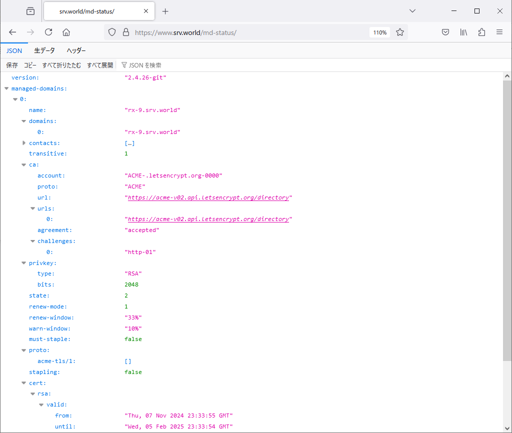 | [5] | इस प्रकार [openssl] कमांड के साथ प्रमाणपत्र की समाप्ति तिथि और अन्य की पुष्टि करना संभव है। या आपके द्वारा [2] पर सेट किए गए [md-status] के यूआरएल तक पहुंचने के लिए उन्हें देखना संभव है। |