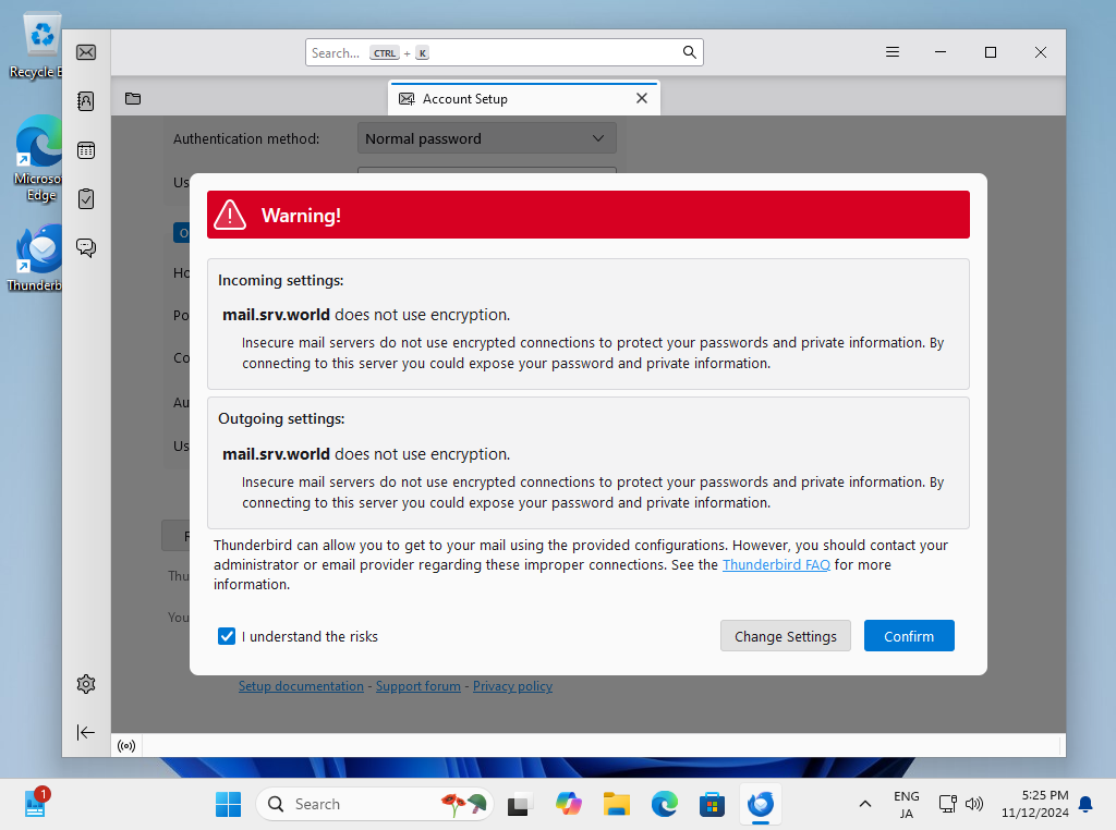| [5] | चेतावनियाँ दिखाई गई हैं क्योंकि कनेक्शन एन्क्रिप्टेड नहीं है। यदि ठीक है, तो [संपन्न] बटन पर क्लिक करें, यदि ठीक नहीं है, तो SSL/TLS सेटिंग अनुभाग को देखने के लिए और अधिक कॉन्फ़िगर करें। |