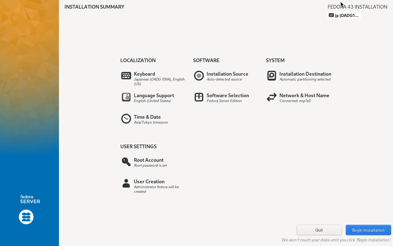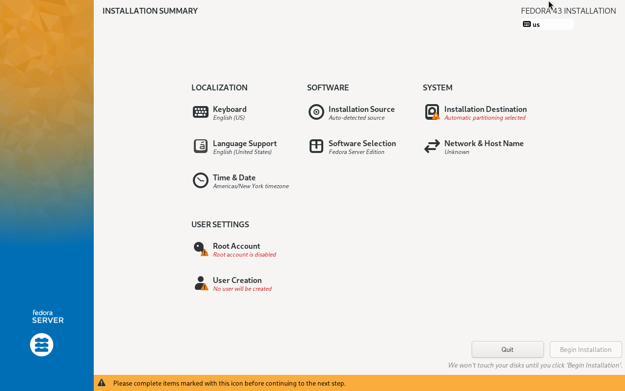 | [13] | चयनों की पुष्टि करें और यदि सब कुछ ठीक है, तो Fedora स्थापित करने के लिए [इंस्टॉलेशन शुरू करें] पर क्लिक करें। |
