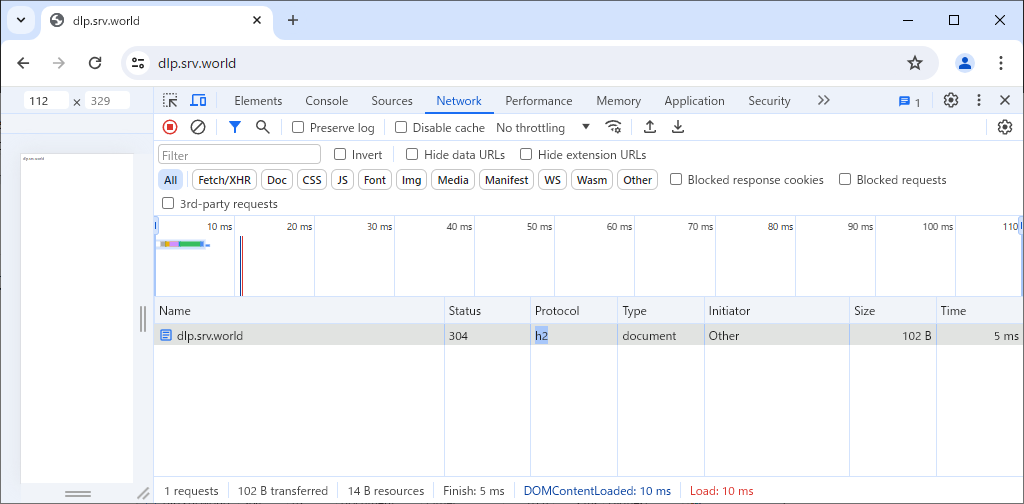 | वेब ब्राउज़र एक्सेस से प्रतिक्रिया हेडर में HTTP/2 देखना संभव है। नीचे दिया गया उदाहरण Google Chrome पर है। यदि HTTP/2 सक्षम है, तो प्रतिक्रिया हेडर में [प्रोटोकॉल] निम्नानुसार [h2] में बदल जाता है। |