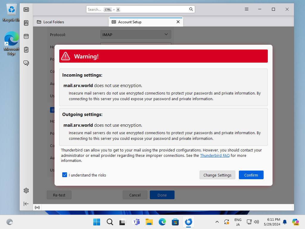 | [5] | चेतावनियाँ दिखाई गई हैं क्योंकि कनेक्शन एन्क्रिप्टेड नहीं है। यदि ठीक है, तो [संपन्न] बटन पर क्लिक करें, यदि ठीक नहीं है, तो SSL/TLS सेटिंग्स अनुभाग को देखने के लिए और अधिक कॉन्फ़िगर करें। |
