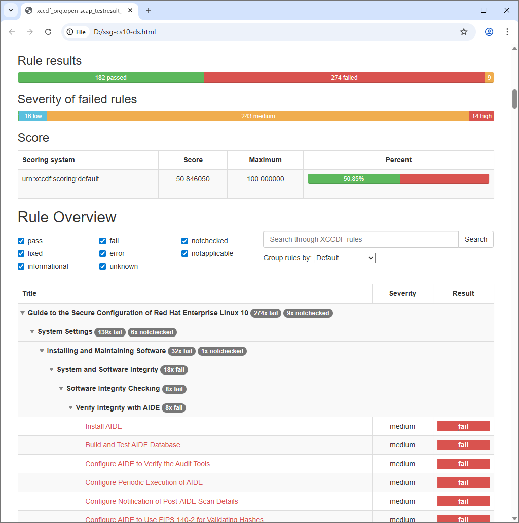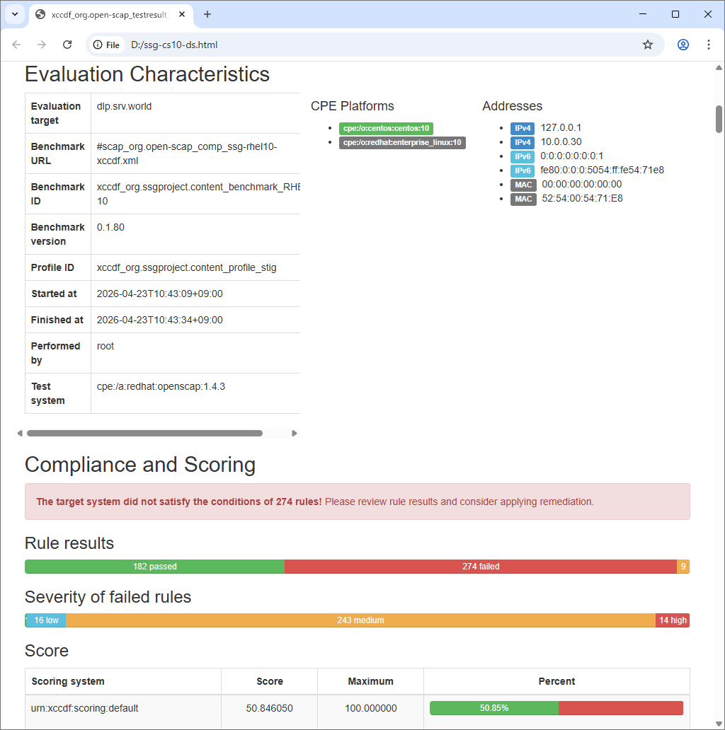 --fix-type bash \ --output ssg-cs10-ds-remediation.sh \ --result-id xccdf_org.open-scap_testresult_xccdf_org.ssgproject.content_profile_stig \ ssg-cs10-ds.xml total 16020 -rw-------. 1 root root 981 Dec 14 2024 anaconda-ks.cfg -rwx------. 1 root root 1599788 Apr 23 10:53 ssg-cs10-ds-remediation.sh -rw-r--r--. 1 root root 14797108 Apr 23 10:43 ssg-cs10-ds.xml # 修正スクリプト実行 [root@dlp ~]# ./ssg-cs10-ds-remediation.sh ..... ..... Remediating rule 111/112: 'xccdf_org.ssgproject.content_rule_service_usbguard_enabled' Created symlink /etc/systemd/system/basic.target.wants/usbguard.service → /usr/lib/systemd/system/usbguard.service. Remediating rule 112/112: 'xccdf_org.ssgproject.content_rule_usbguard_allow_hid_and_hub' # 再度チェック実行 [root@dlp ~]# oscap xccdf eval \ --profile xccdf_org.ssgproject.content_profile_stig \ --results ssg-cs10-ds.xml \ --report ssg-cs10-ds.html \ /usr/share/xml/scap/ssg/content/ssg-cs10-ds.xml |