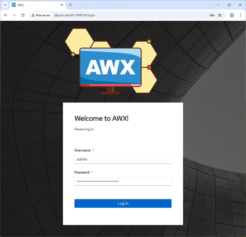 debian@dlp:~$ kubectl get pods -l "app.kubernetes.io/managed-by=awx-operator" NAME READY STATUS RESTARTS AGE ansible-awx-migration-24.6.1-dz8r6 0/1 Completed 0 5m43s ansible-awx-postgres-15-0 1/1 Running 0 7m5s ansible-awx-task-56b76c65f9-gljvr 4/4 Running 0 6m32s ansible-awx-web-6f6c9cf7b6-7zjnh 3/3 Running 0 6m33sdebian@dlp:~$ kubectl get service -l "app.kubernetes.io/managed-by=awx-operator" NAME TYPE CLUSTER-IP EXTERNAL-IP PORT(S) AGE ansible-awx-postgres-15 ClusterIP None <none> 5432/TCP 7m27s ansible-awx-service NodePort 10.104.16.165 <none> 80:30333/TCP 6m57s # サービス URL 確認 debian@dlp:~$ minikube service ansible-awx-service --url -n ansible-awx http://192.168.39.176:30333 # 管理アカウントのパスワード 確認 debian@dlp:~$ kubectl get secret ansible-awx-admin-password -o jsonpath="{.data.password}" | base64 --decode; echo joXV5pVPnYdNYFZBkGvvzdkdFUBbM2Bl # Kubernetes クラスター外部からもアクセスできるようにするには要ポートフォワード # [10445] ⇒ Minikube インストールホストが待ち受けるポート ⇒ 任意の空きポートを指定すれば OK # [80] ⇒ AWX コンテナーが待ち受けているポート debian@dlp:~$ kubectl port-forward service/ansible-awx-service --address 0.0.0.0 10445:80 Forwarding from 0.0.0.0:10445 -> 8052 |