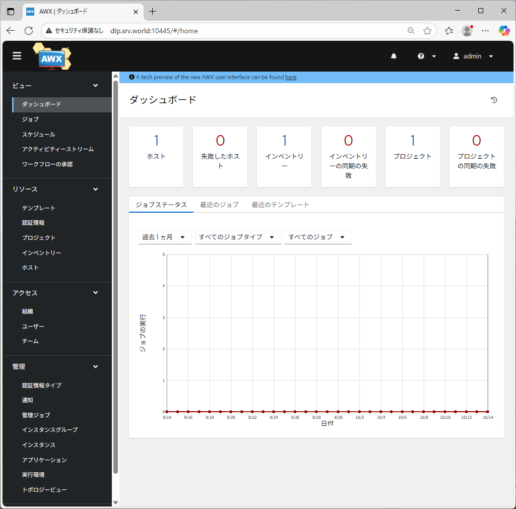 | [6] | 正常にログインすると、Ansible AWX のダッシュボードが表示されます。以上でインストール完了です。 |