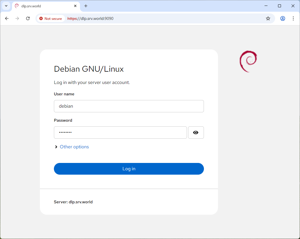 [2] | ローカルホスト または 任意のクライアントコンピューターで Web ブラウザーを起動し、[https://(サーバーのホスト名 または IP アドレス):9090/] へアクセスすると、Cockpit