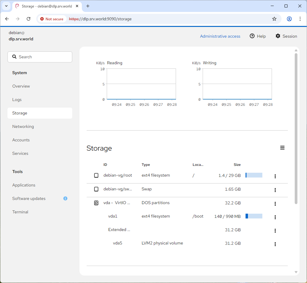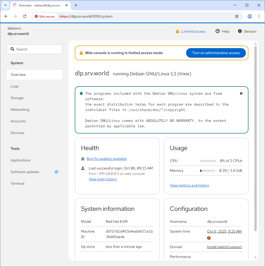 [3] | Cockpit のメイン画面になります。ここから様々なシステム管理操作を行うことができます。 管理者権限で操作したい場合は、[Turn on administrative access] をクリックして認証が必要です。 |
