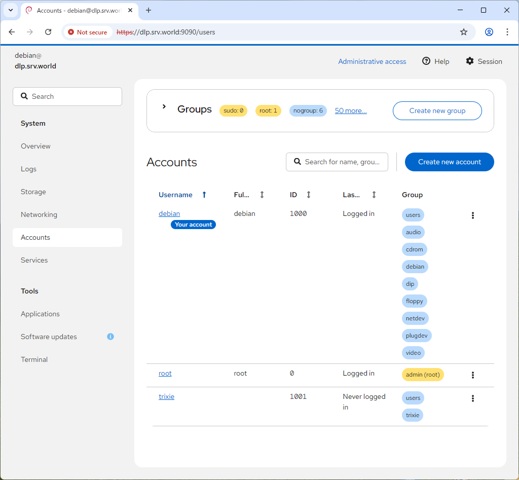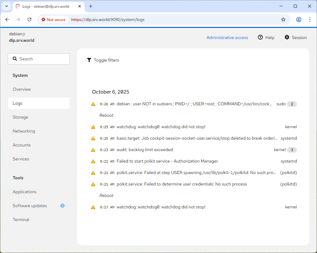 # デフォルトでは root は Cockpit ログイン禁止となっている root@dlp:~# cat /etc/cockpit/disallowed-users # List of users which are not allowed to login to Cockpit root |