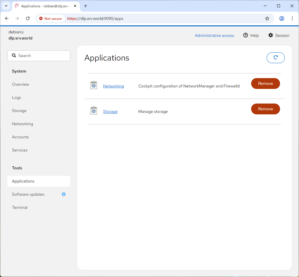 [9] | 左メニュー [Applications] では、各アプリケーションのインストールや削除操作が可能です。 |