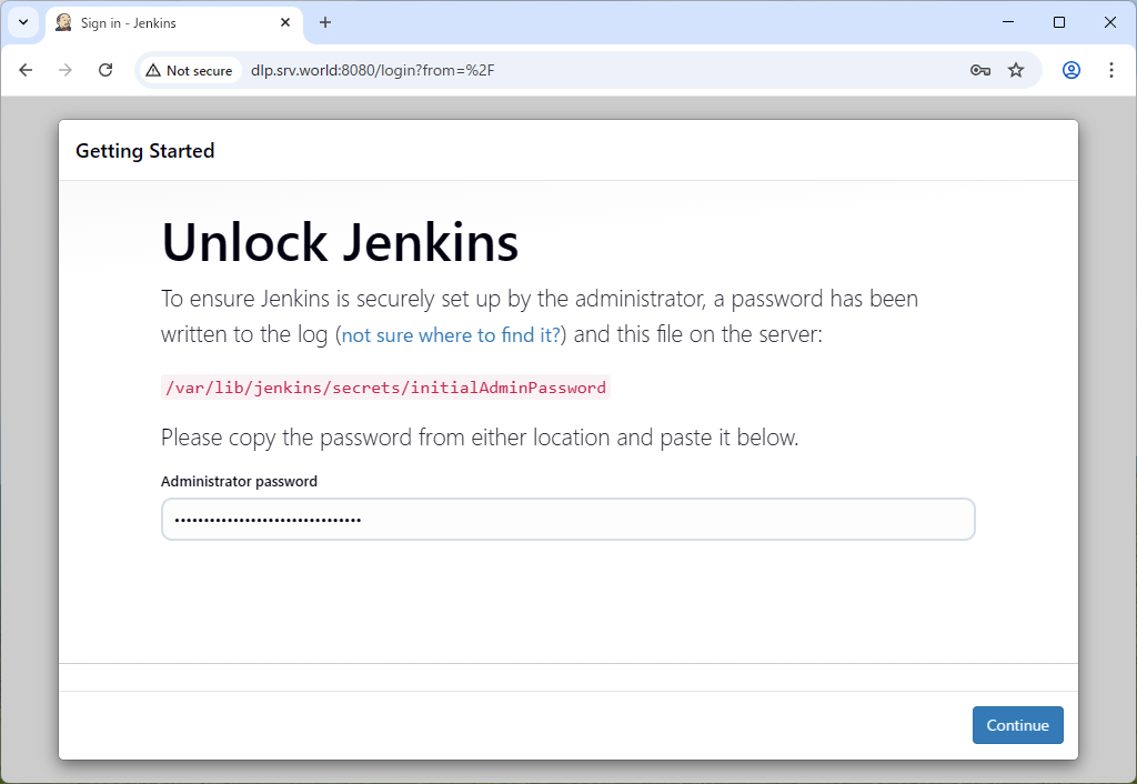 | [3] | 任意のクライアントコンピューターで Web ブラウザーを起動し、[http://(サーバーのホスト名 または IP アドレス):8080/] にアクセスします。 初回アクセス時は管理者用のイニシャルパスワードの入力が求められます。イニシャルパスワードは画面に記載の通り、[/var/lib/jenkins/secrets/initialAdminPassword] に記載してあるのでコピーする等して次へ進めます。 |