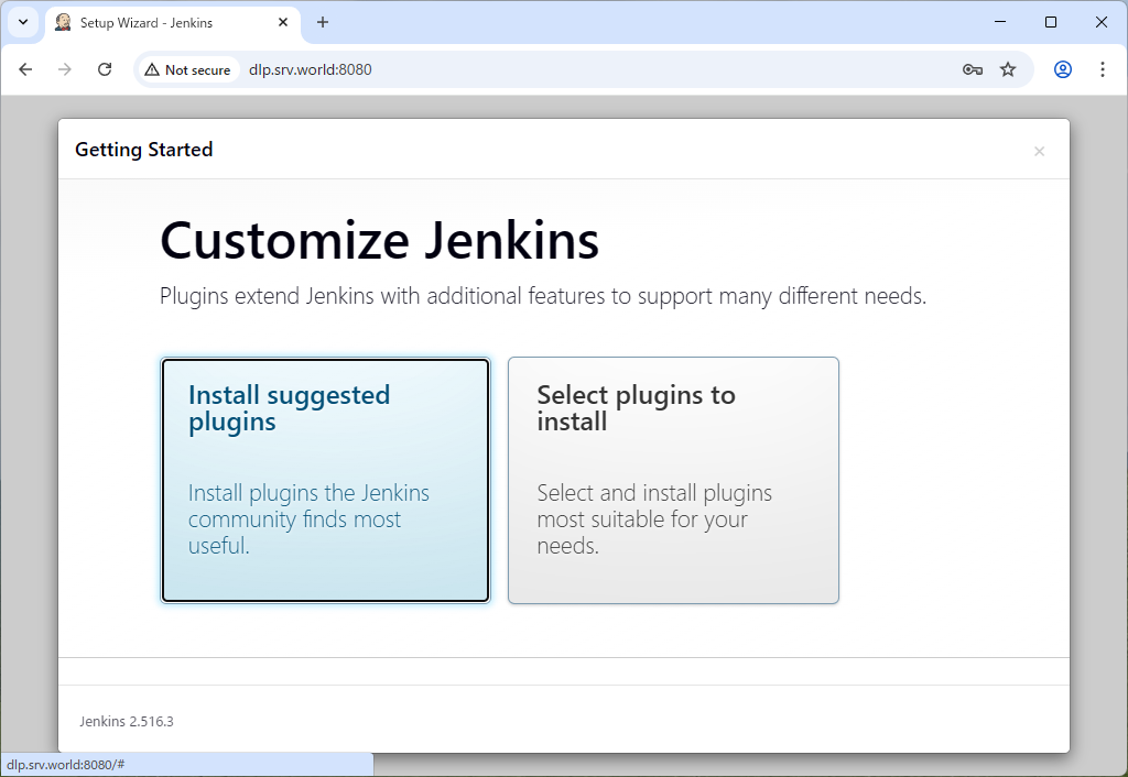 | [4] | Jenkins の初回セットアップになります。Jenkins コミュニティ推奨のプラグインをインストールするか、自身でプラグインを選択するか、を選択します。 当例では推奨プラグインのインストールを選択して進めます。 |